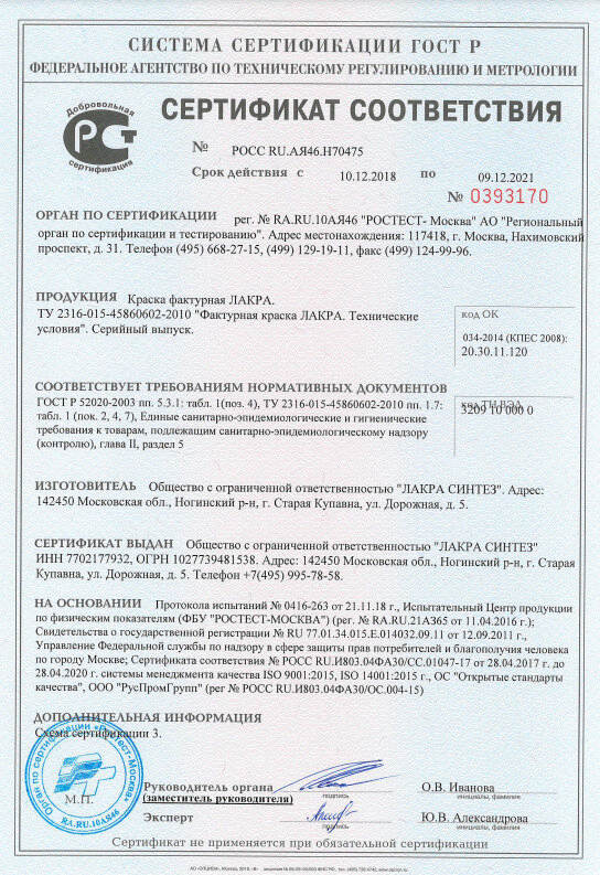| Дополнительная информация | состав: водная акриловая дисперсия, диоксид титана, мел, молотый мрамор, гидроксиэтилцеллюлоза, целевые добавки; время корректировки фактуры: в течение 1 часа; время высыхания до потери подвижности: 2-6 часов; полный набор твёрдости и прочности происходит в течение 7-10 суток; при колеровке: пропорция на 1 кг краски не более 50 г колера; допускается транспортировка краски при температуре до минус 35°С |