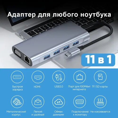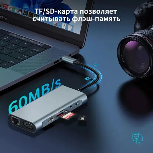 | Дополнительная информация | Тип интерфейса: USB Type-C Порты: 11 Стандарт: USB 3,0 Функция: HDMI-совместимый/кард-ридер/RJ45. Цвет: серый Материал: алюминиевый сплав Выходной интерфейс: USB2.0 * 3/USB3.0 * 1/RJ45 100mbps * 1/VGA * 1/4k HDMI-совместимый * 1/87W PD * 1/3.5 мм * 1/порт TF/порт SD |