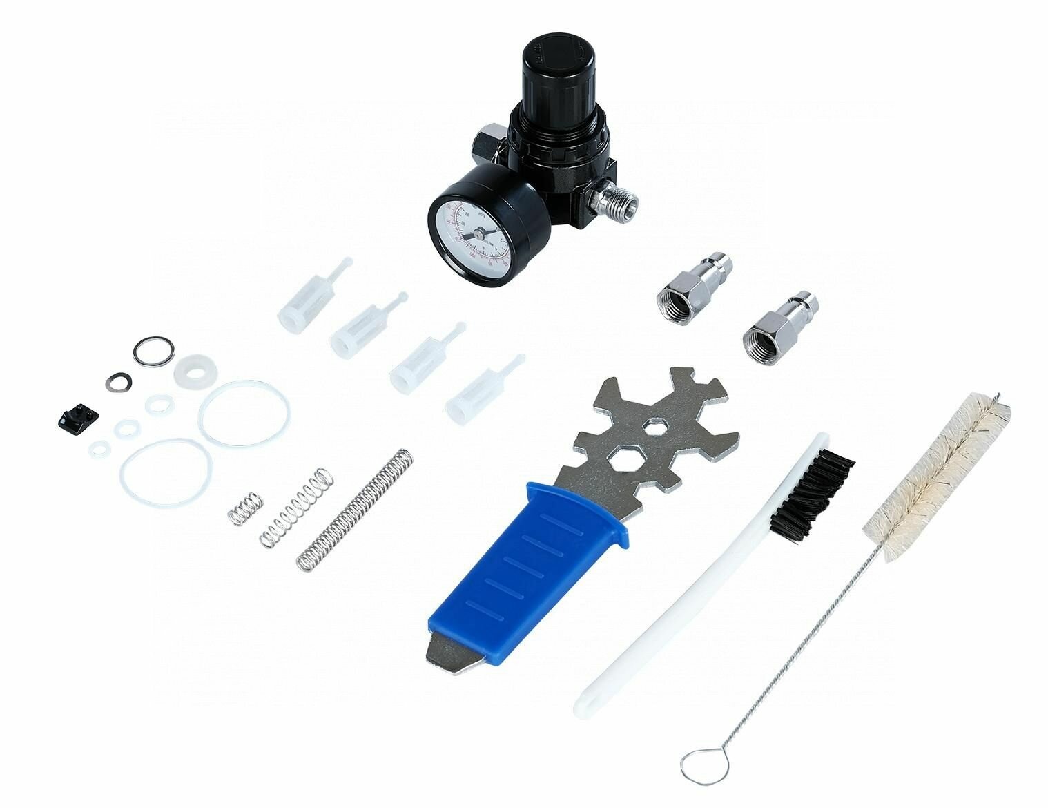 | Комплектация | Краскопульт; Редуктор; Ключ для разборки; Щетка для чистки; Сменный фильтр - 3 шт.; Ремкомплект; Быстросъемный переходник - 2 шт.; Инструкция. |