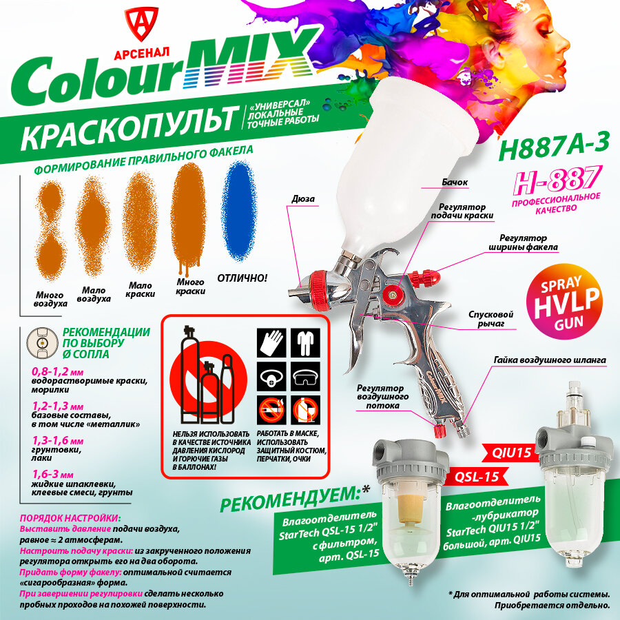 Отзывы на Краскопульт пневматический H-887 сопло 1,3мм, верх пласт. бачок V-600мл. COLOUR MIX, H887A-3