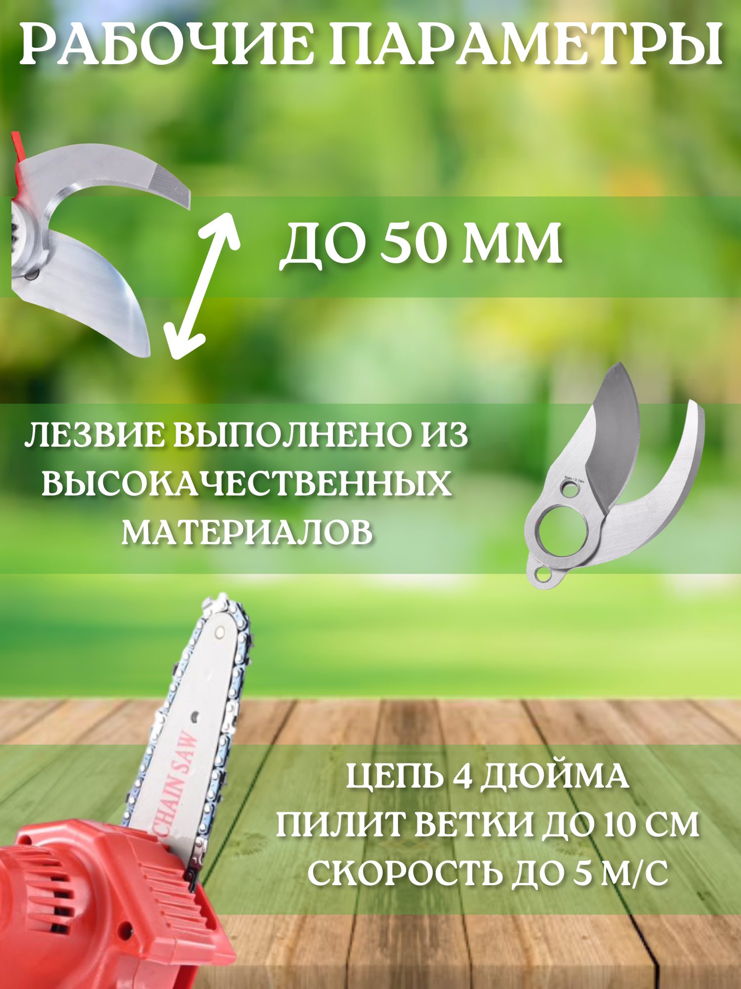 | Дополнительная информация | Для того чтобы активировать секатор, нужно вставить аккумулятор, нажать на кнопку, и два раза нажать на курок |