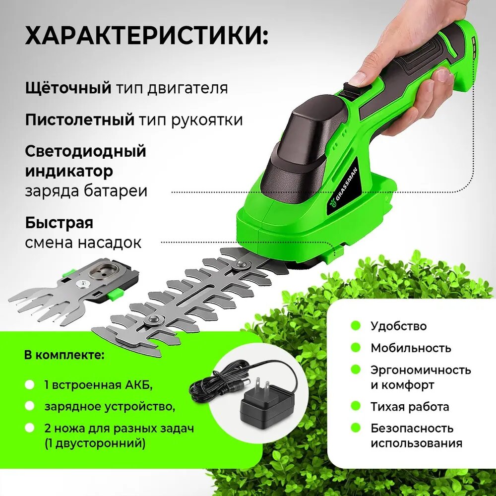 10 цен на Кусторез аккумуляторный GRASSMAN CH-3602, 3,6В, 1.5Ач, 2 в 1, длина реза 120 мм, 1 АКБ, ЗУ
