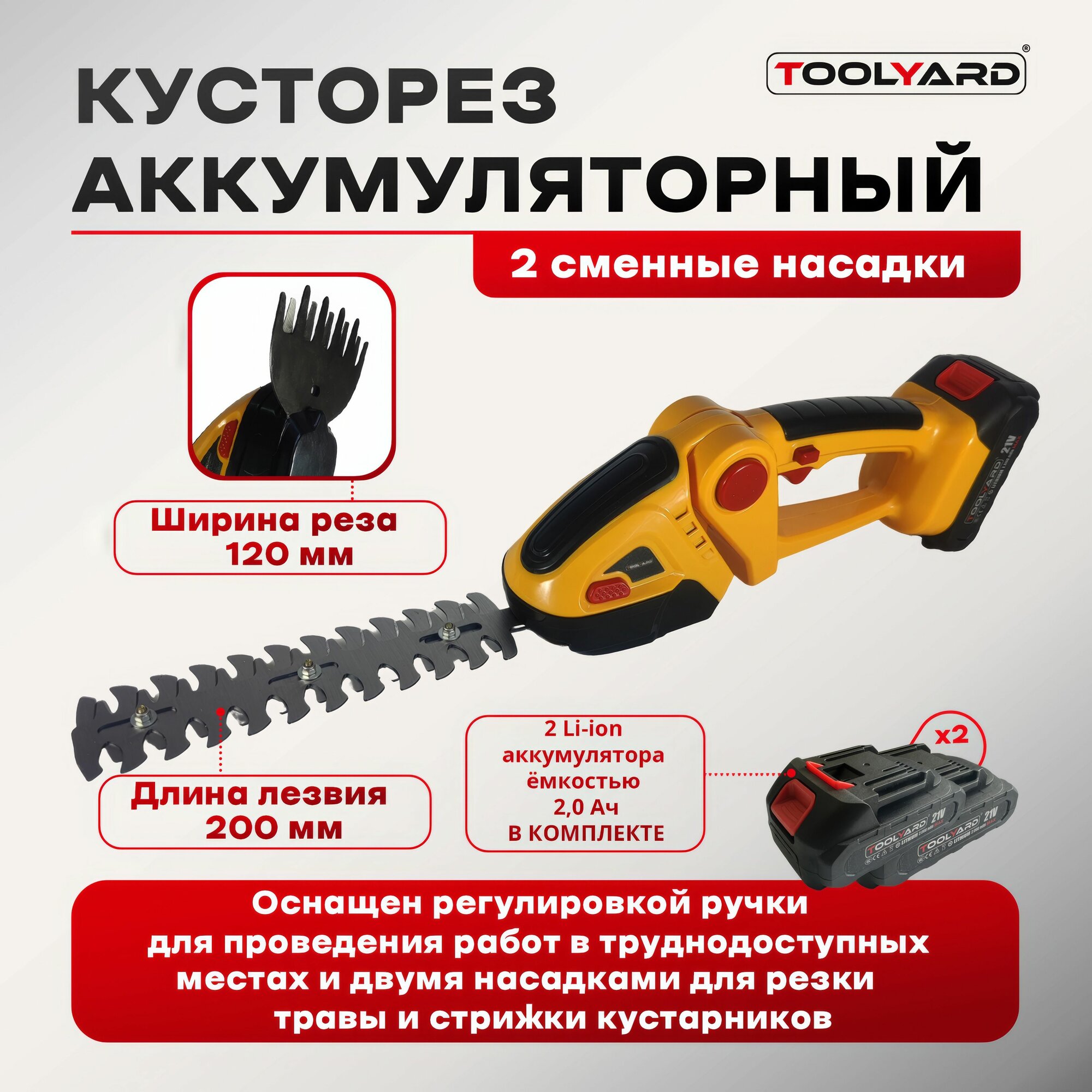 Кусторез аккумуляторный TOOLYARD, ножницы садовые для газона и кустов, электрический, 2 АКБ 21V 2Ач информация: