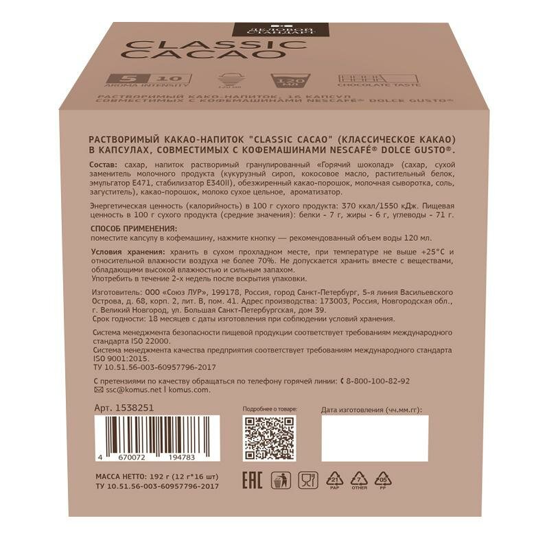 Какао в капсулах Деловой стандарт Classic Chocolate, 16кап/уп (DG) 1832608 информация: