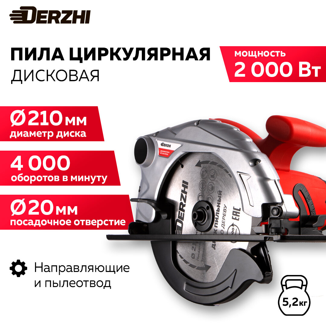 Дисковая пила (циркулярная) DERZHI 2000Вт (210х20мм, 70 мм пропил, 4000 оборотов/мин) информация: