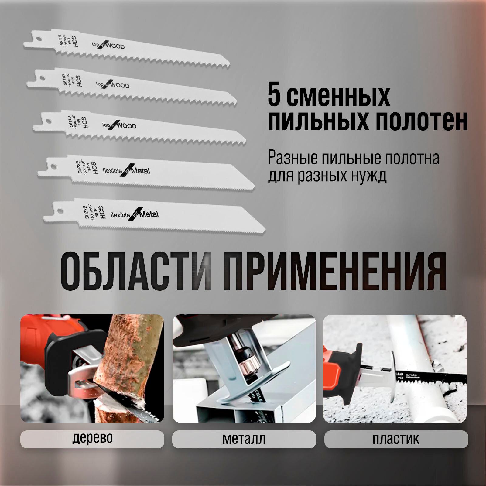Отзывы на Пила сабельная аккумуляторная, 20 В, 2 Ач, Li-ion, 2600 об/мин, 5 полотен в комплекте 10073