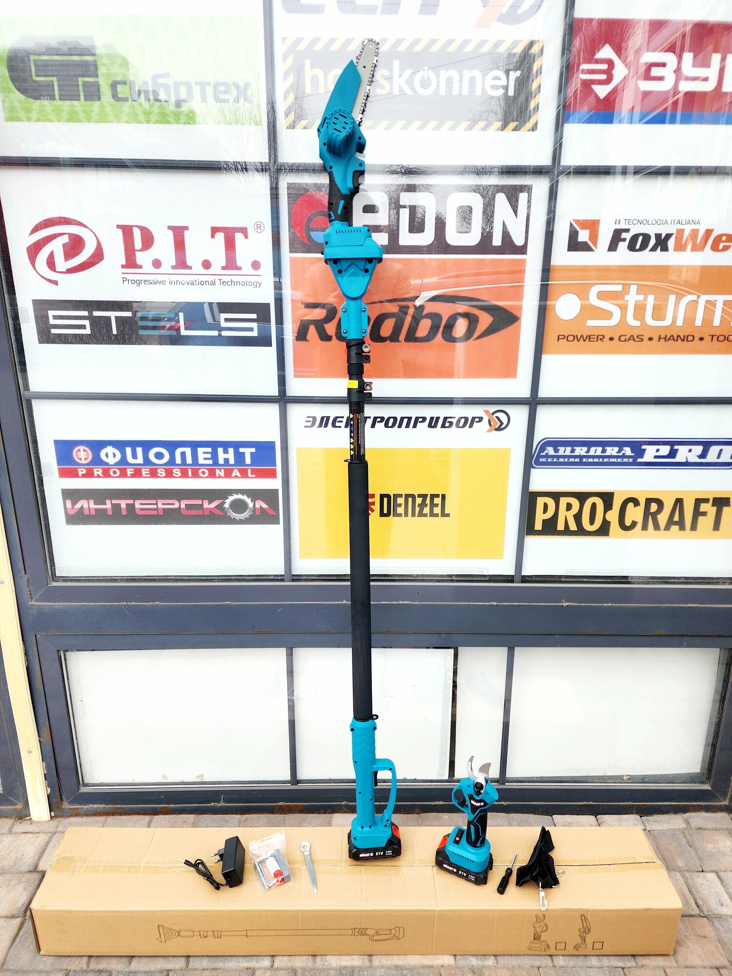 | Комплект поставки | Аккумуляторный секатор; аккумуляторная пини-пила цепная; штанга-телескопическая; аккумулятор 2шт; набор оснастки; коробка; зарядное устройство |