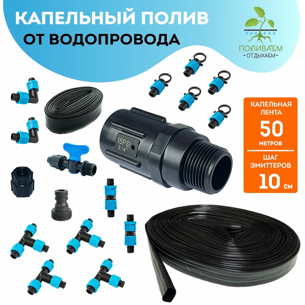 Система капельного полива от водопровода. Капельная лента 50 метров, шаг эмиттеров - 10 см. Набор для автополива. информация: