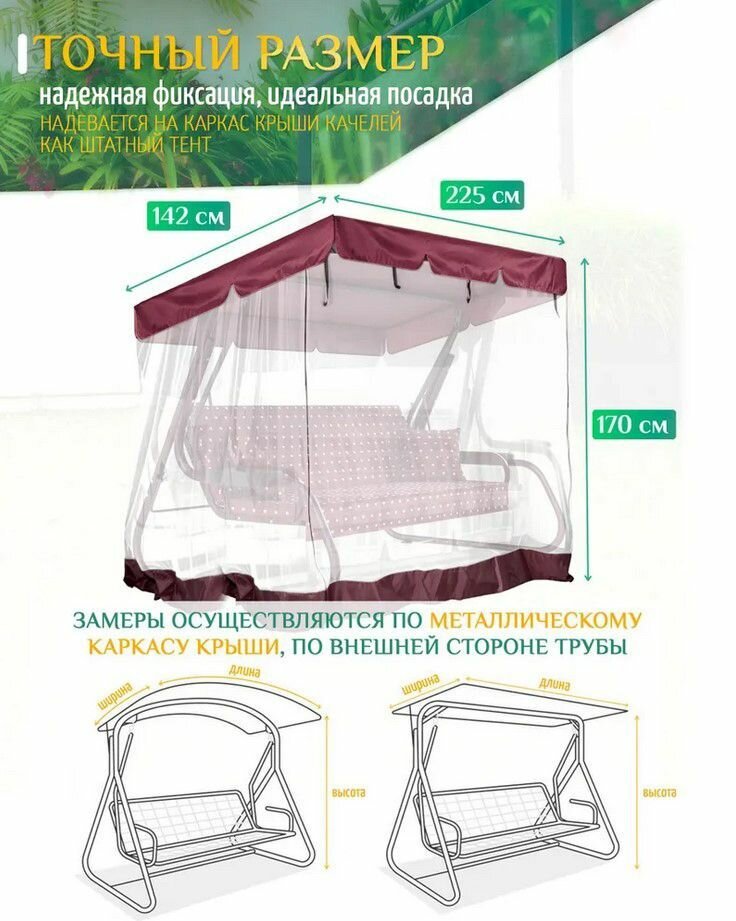 | Дополнительная информация | Тент с москитной сеткой для садовых качелей из уплотненной ткани Оксфорд 240D и прочной сеткой |