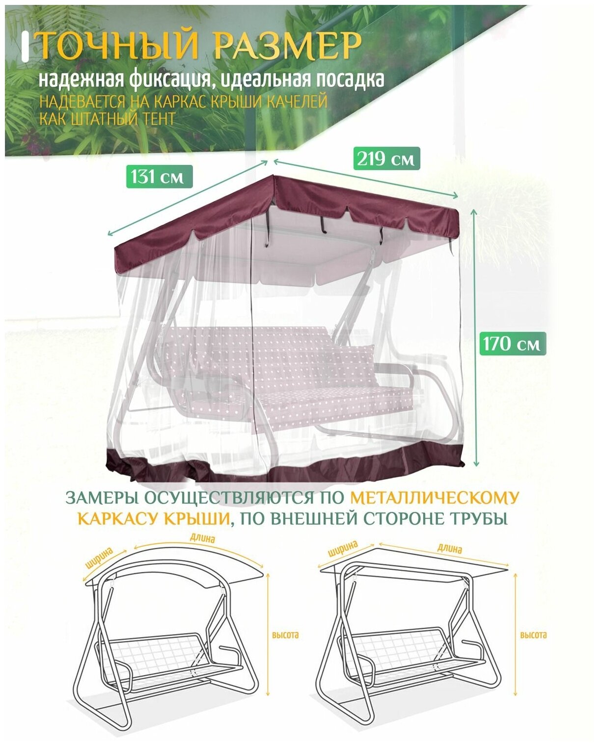 | Дополнительная информация | Тент с москитной сеткой для садовых качелей из уплотненной ткани Оксфорд 240D и прочной сеткой |