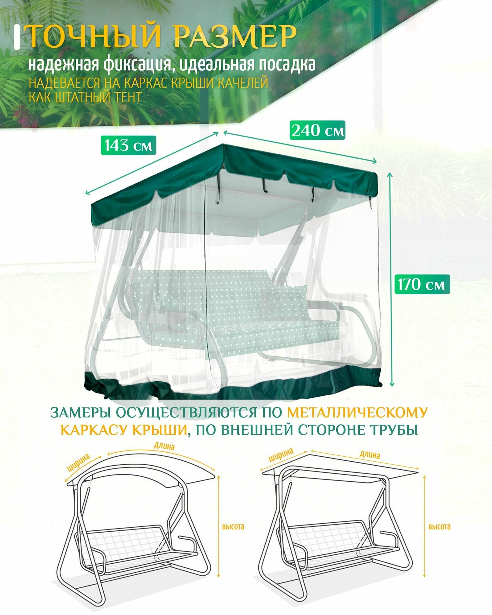 | Дополнительная информация | Тент с москитной сеткой для садовых качелей из уплотненной ткани Оксфорд 240D и прочной сеткой |