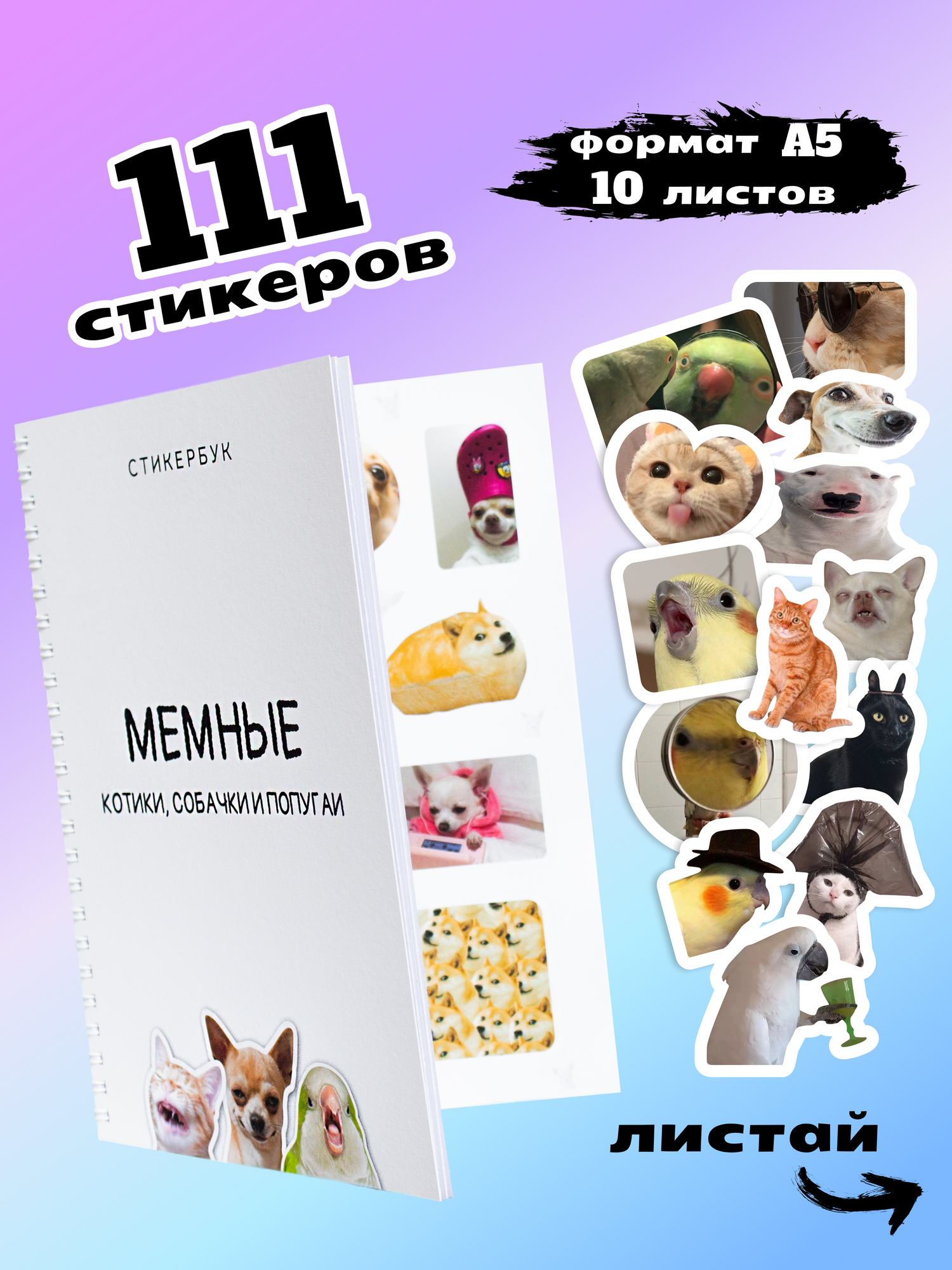 10 цен на Стикербук "Мемные котики, собачки и попугаи", формат А5, 10 листов, более 100 наклеек
