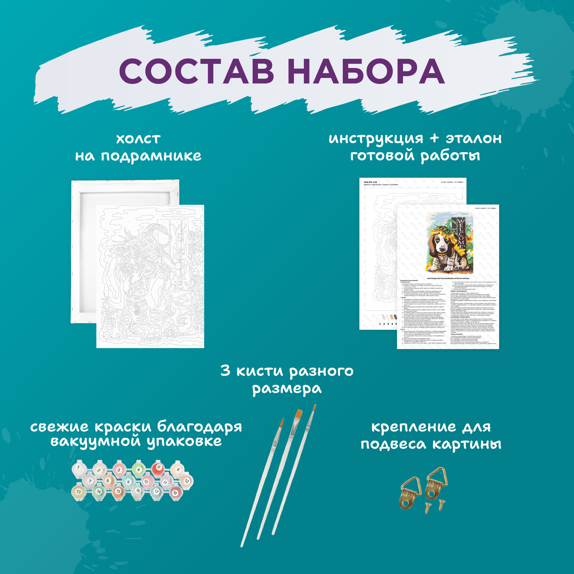 | Комплектация | холст на подрамнике, акриловые краски в пронумерованных баночках, три кисти разного размера, инструкция с контрольным листом и эталоном готовой картины |