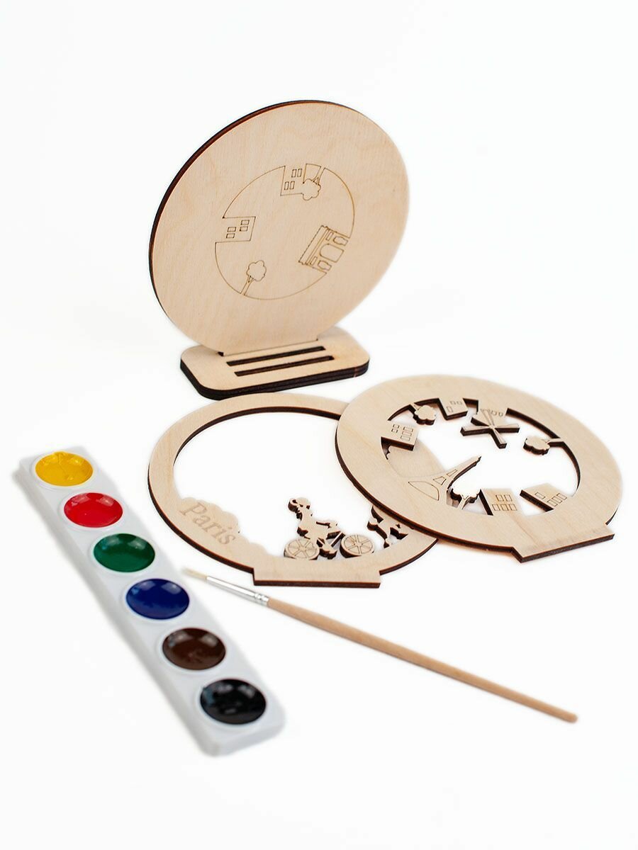 | Подробная комплектация | Деревянные заготовки - 3 шт; краски акварель - 6 цветов; деревянная подставка; кисточка; инструкция; подарок |