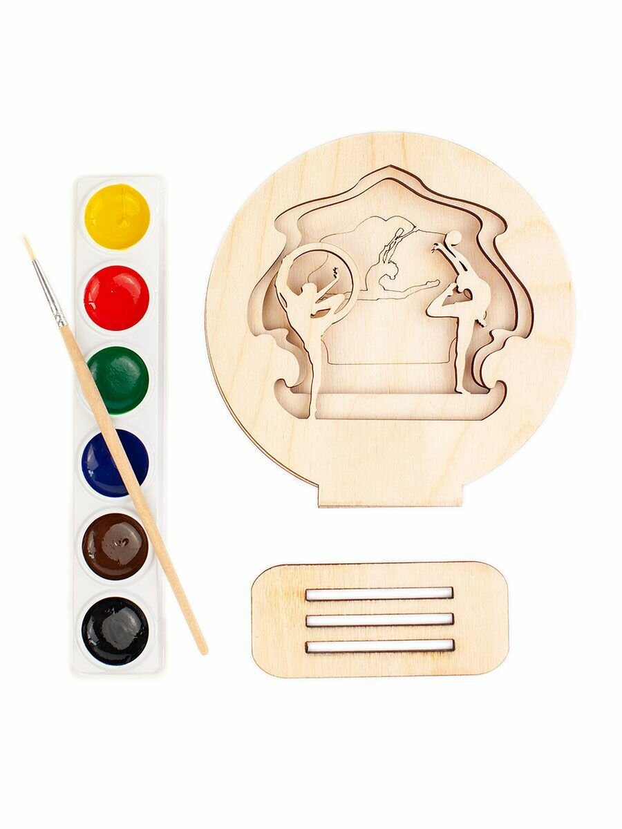 | Подробная комплектация | Деревянные заготовки - 3 шт; краски акварель - 6 цветов; деревянная подставка; кисточка; инструкция; подарок |