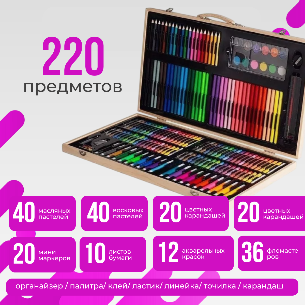 Набор для рисования и творчества 220 предметов в деревянном кейсе информация: