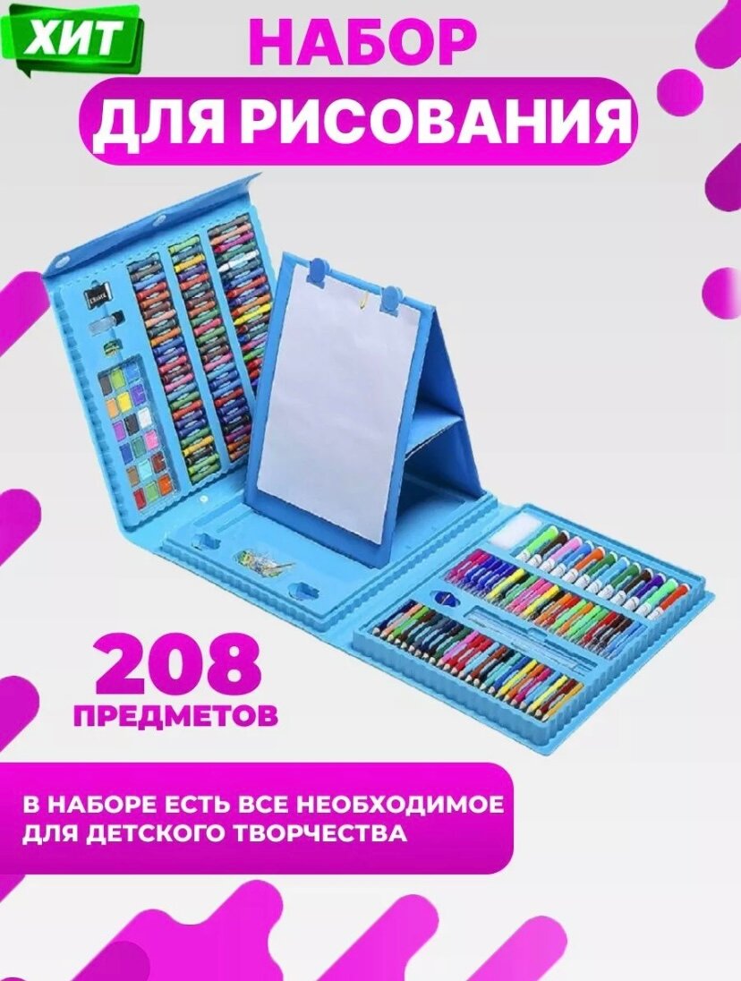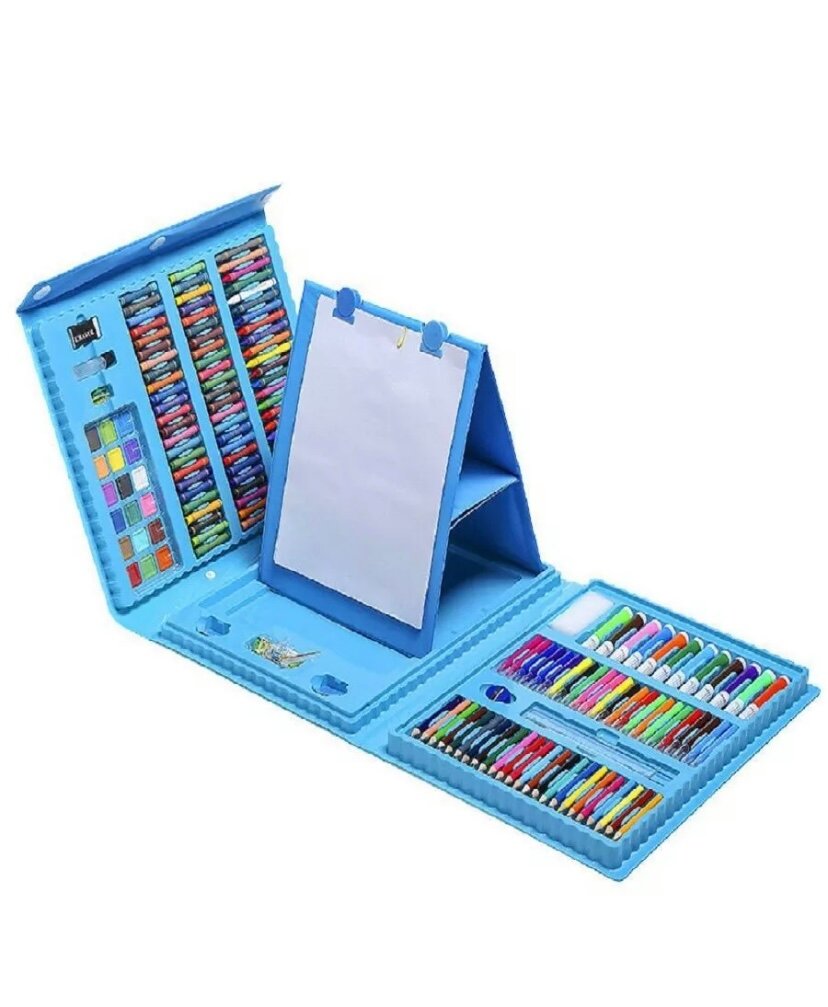 Набор для рисования "Чемоданчик юного художника", 208 предметов: карандаши, кисти, краски, фломастеры. с мольбертом, Голубой информация: