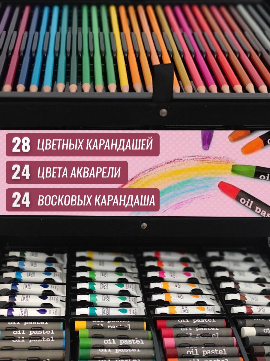 | Комплектация | масляные краски 24 шт, пастель 24 шт, фломастеры 33 шт, цветные карандаши 28 шт, акварельные краски 24 шт, кисти 4 шт, палитра 2 шт, простые карандаши 2 шт, замешанный ластик, ластик, точилка, чемодан |