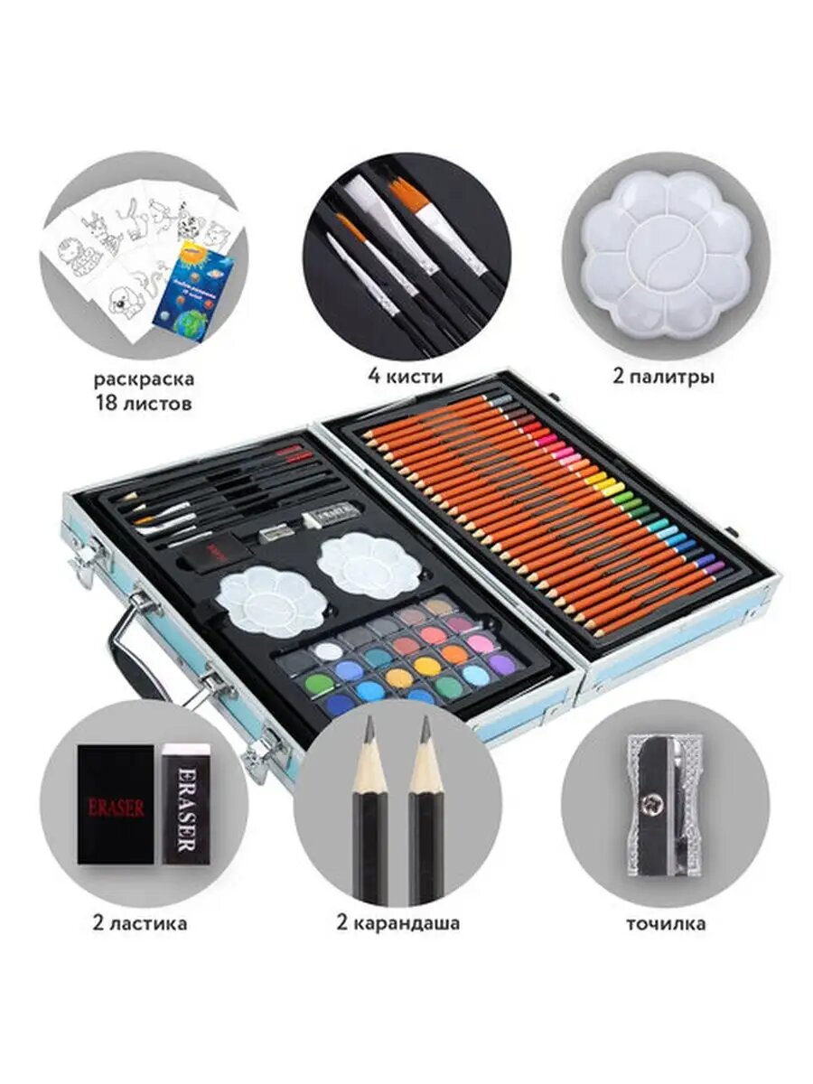 | Состав набора | альбом / карандаши / кисточка / краска / ластик / мольберт / палитра / пастель / точилка / фломастеры |