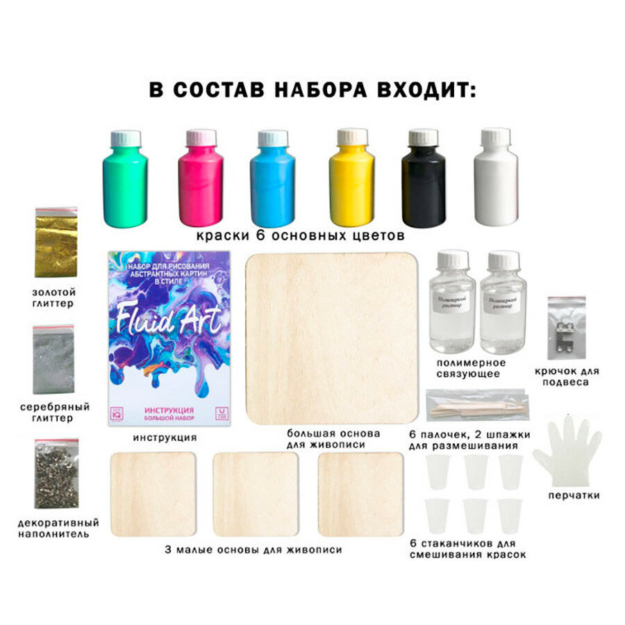 | Комплектация | 6 флаконов с красками; 3 основы для живописи; 1 основа для живописи; 2 флакона с полимерным связующим; 6 палочек для размешивания; 6 стаканчиков для смешивания красок; 2 шпажки; 2 пакетика с глиттером; 1 пакетик с декоративным наполнителем; 1 крючок-подвес; перчатки; инструкция. |