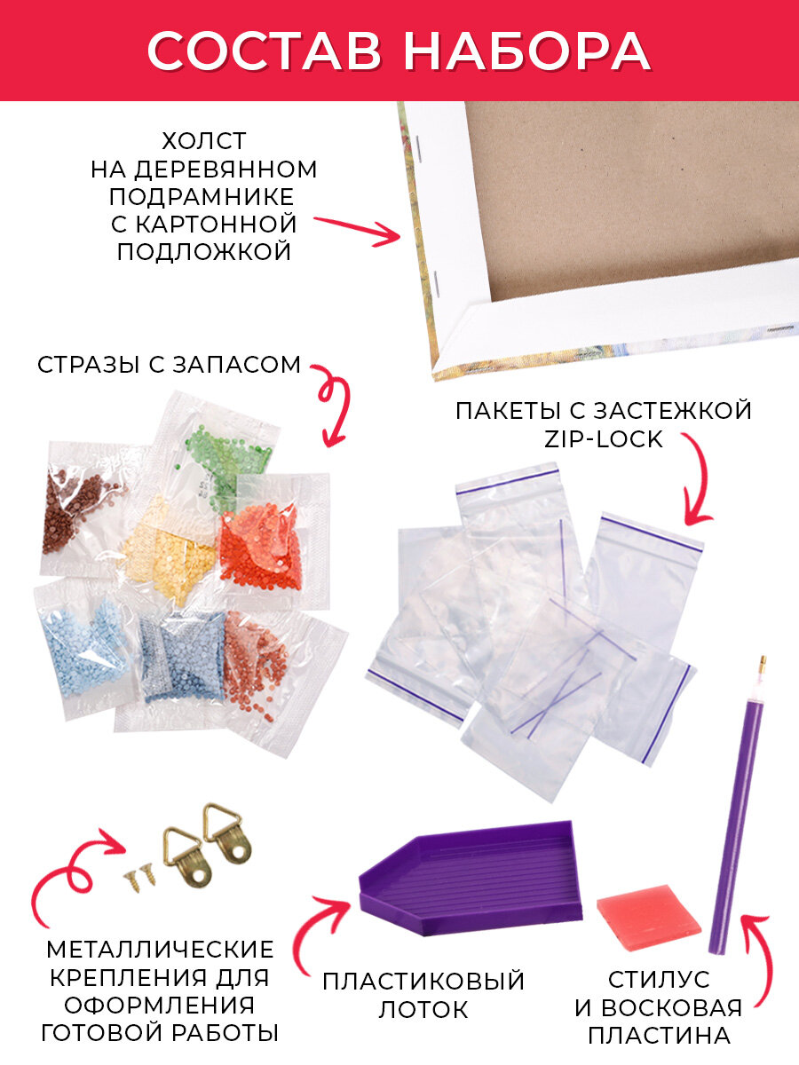 | Комплектация | - тканая основа с клеевым слоем и защитной плёнкой, натянутая на деревянный подрамник с подрамником, - квадратные стразы: 7 цветов, с запасом 20%, - стилус и восковая пластина, - пластиковый лоток, - крепление для подвешивания картины на стену, - пакеты зип-лок для удобного хранения страз |
