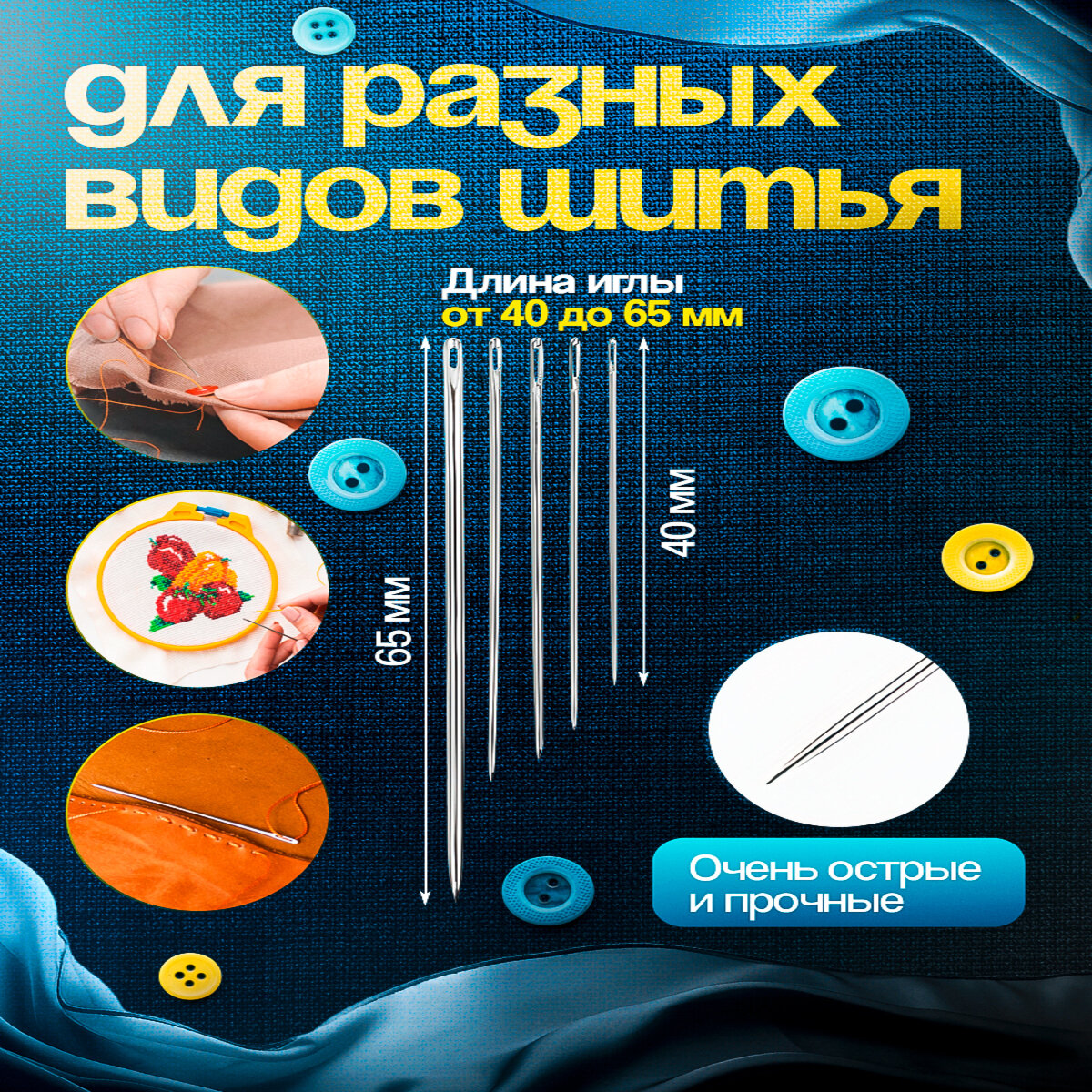 | Тип иглы | вышивальная / гранёно-швейная / мешочная / парусная / синельная / швейная / шорная / штопальная |
