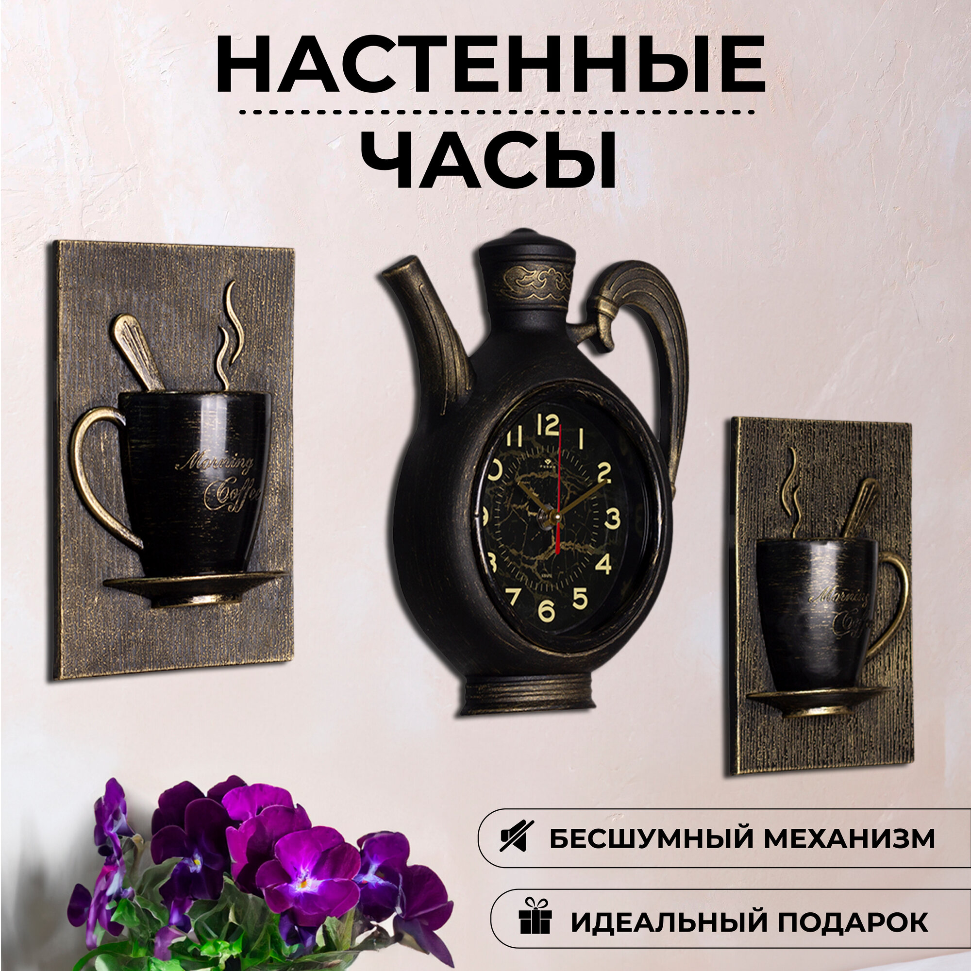 10 цен на Часы настенные интерьерные для кухни "Сангино", бесшумные, 26.5х24 см, чёрные с золотом, АА