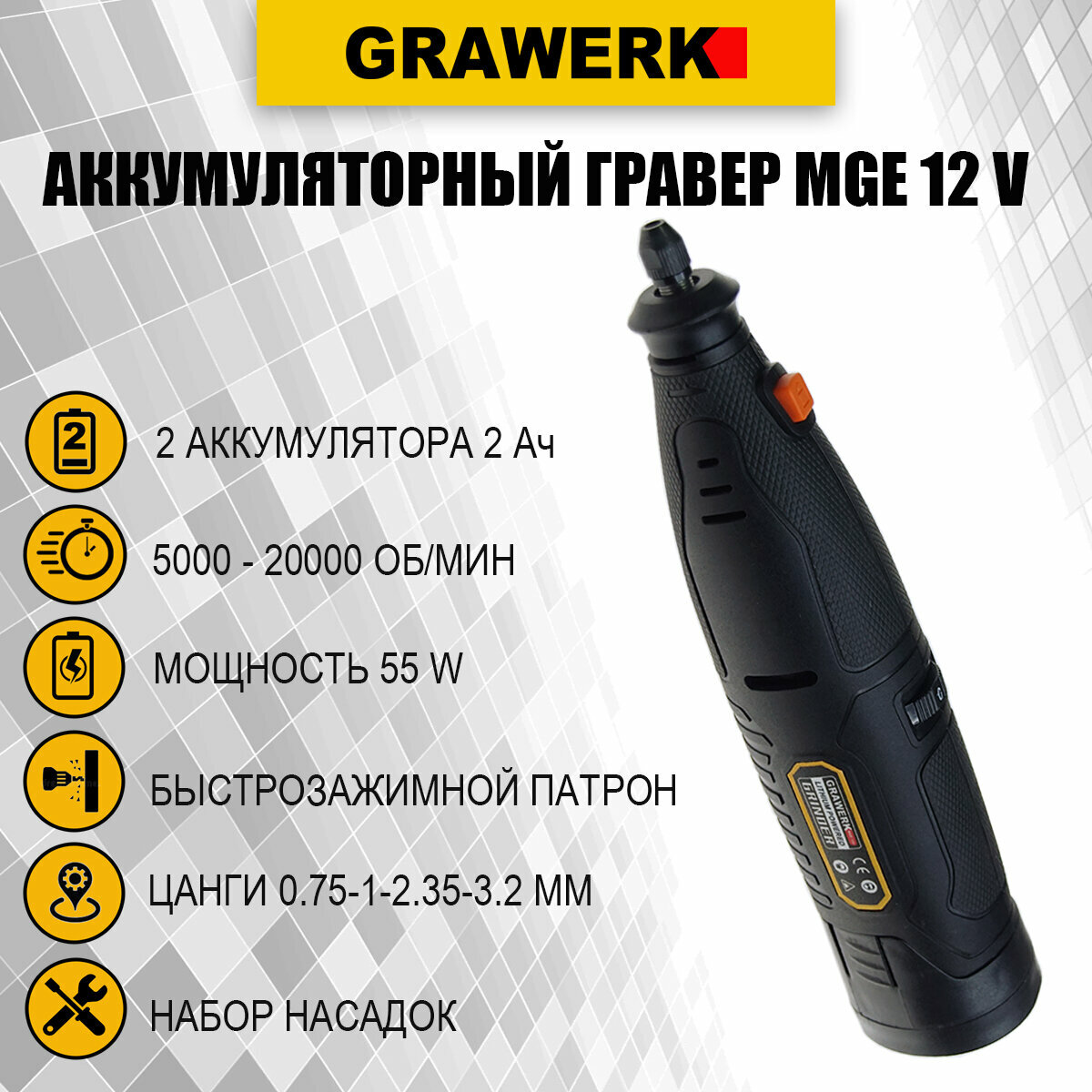 Аккумуляторный гравер Grawerk MGE 12V , 12 Вольт, 2 аккумулятора, набор насадок информация: