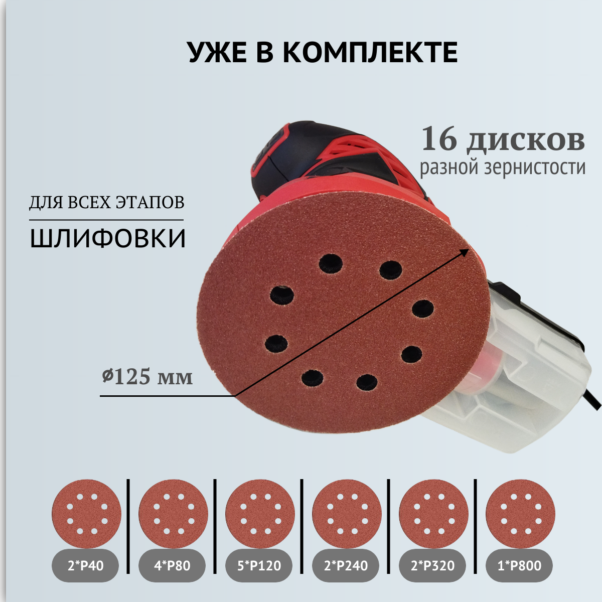 | Комплектация | Шлифмашина 1 шт., Кейс 1 шт., Диски 16 шт., Пылесборники 2 шт., Инструкция 1 шт. |