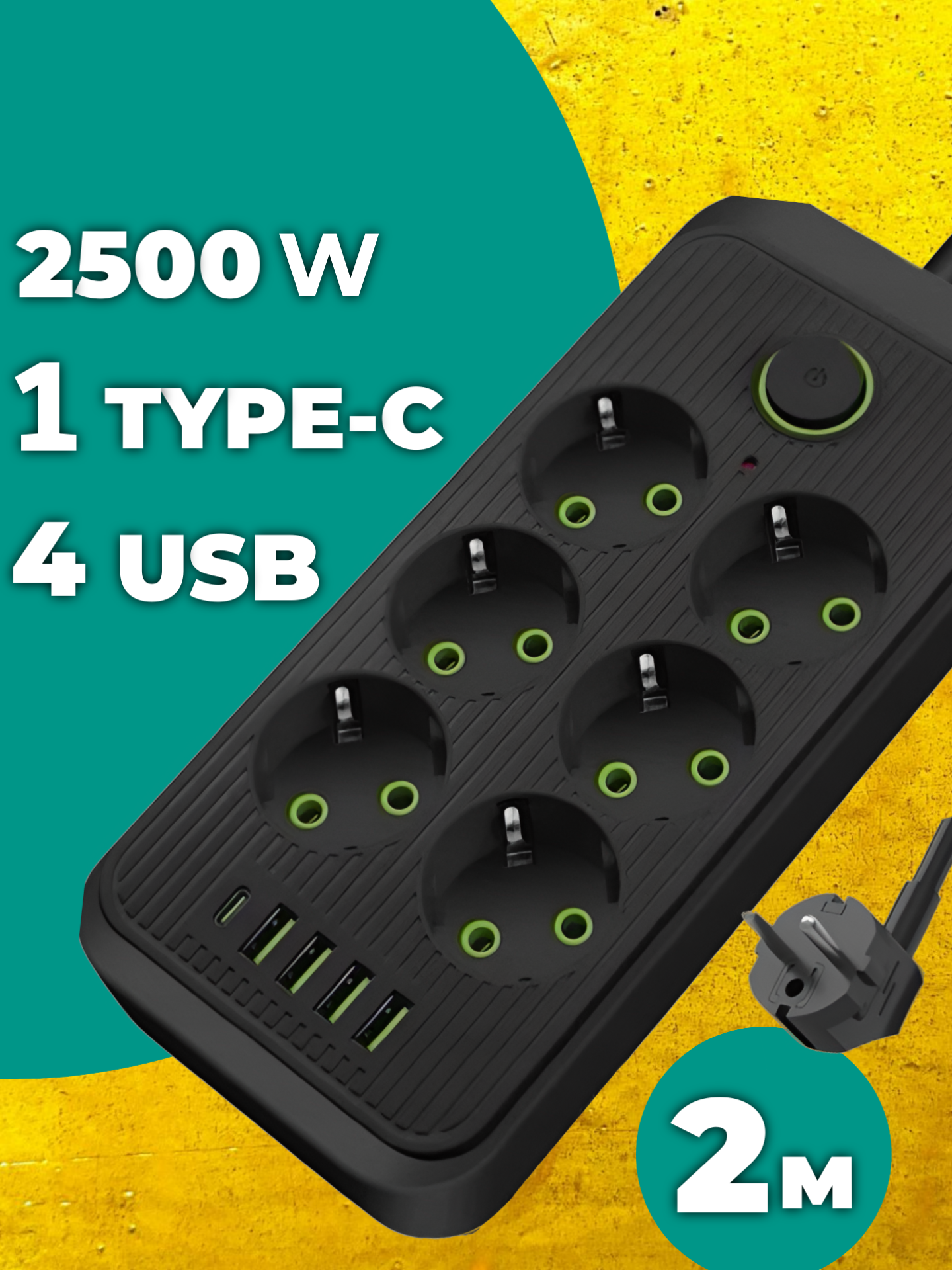 Удлинитель сетевой фильтр с USB зарядкой, 6 розеток 4 USB +1 Type 2 метра информация: