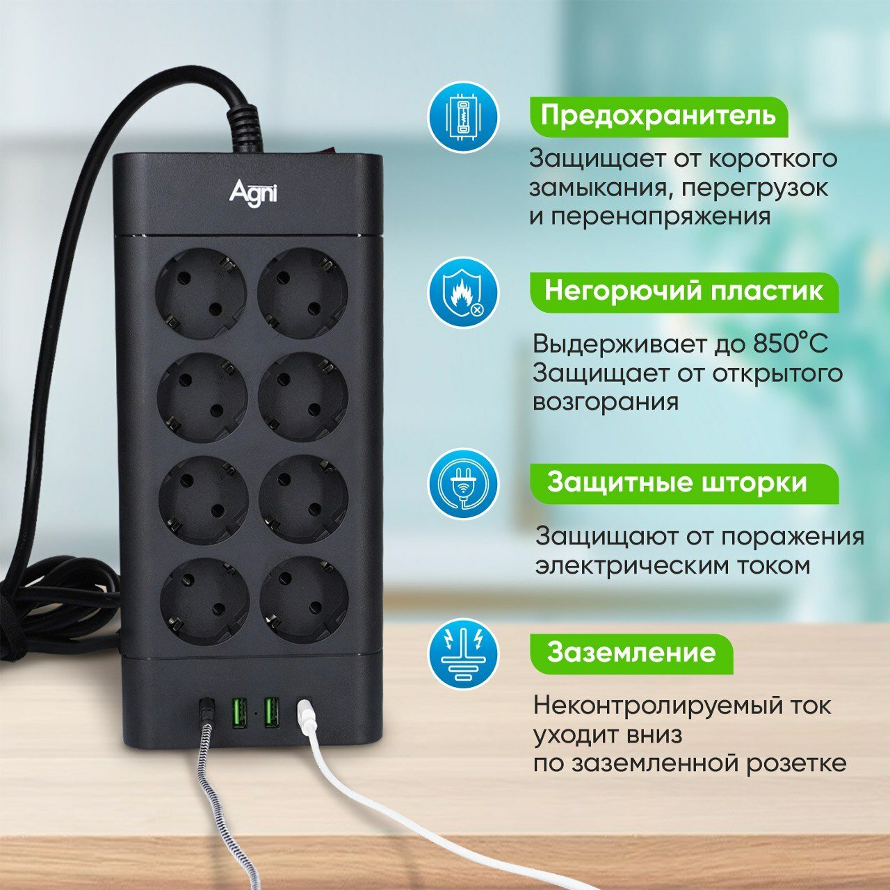 Сетевой фильтр с предохранителем, AGNI, 8 розеток / 4 USB, удлинитель 2 м, защитные шторки, негорючий пластик