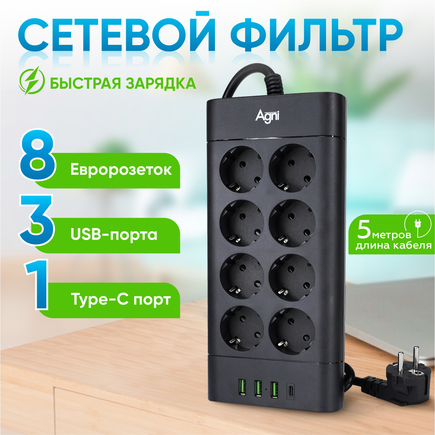 Сетевой фильтр с предохранителем и заземлением AGNI 5 розеток 220V, 3 USB 2.4A, 1 TYPE-C 20W (быстрая зарядка), 16A / 4000Вт