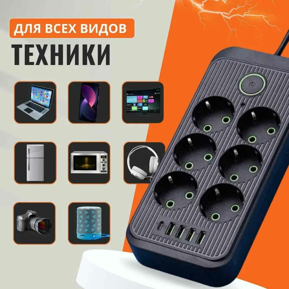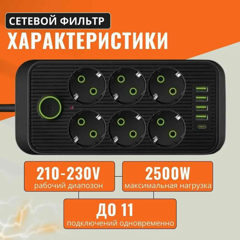 Сетевой фильтр удлинитель с USB и 6 розетками, черный 2 метра от Comfort_Zone информация: