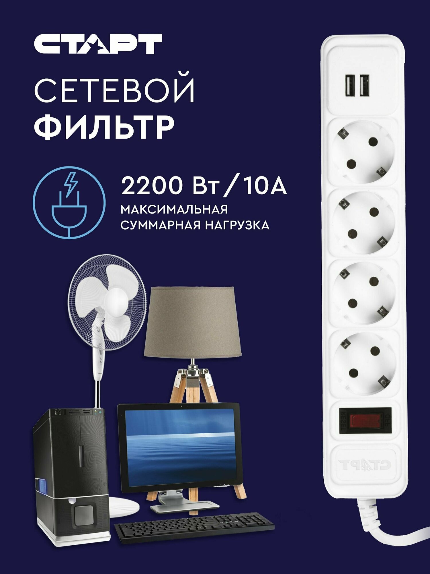 Старт Сетевой фильтр Старт, 5 розеток, 2 USB порта output 2,1А, 16А, 1,5м, белый