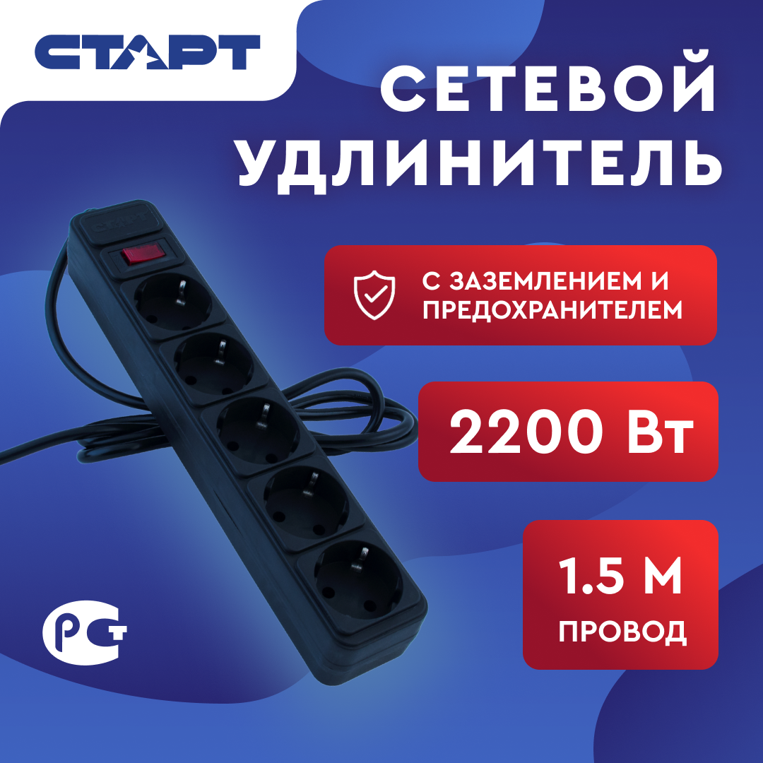 10 цен на Сетевой фильтр с предохранителем 1.5м 5 розеток старт удлинитель бытовой с заземлением, защита от перегрузки и скачков напряжения