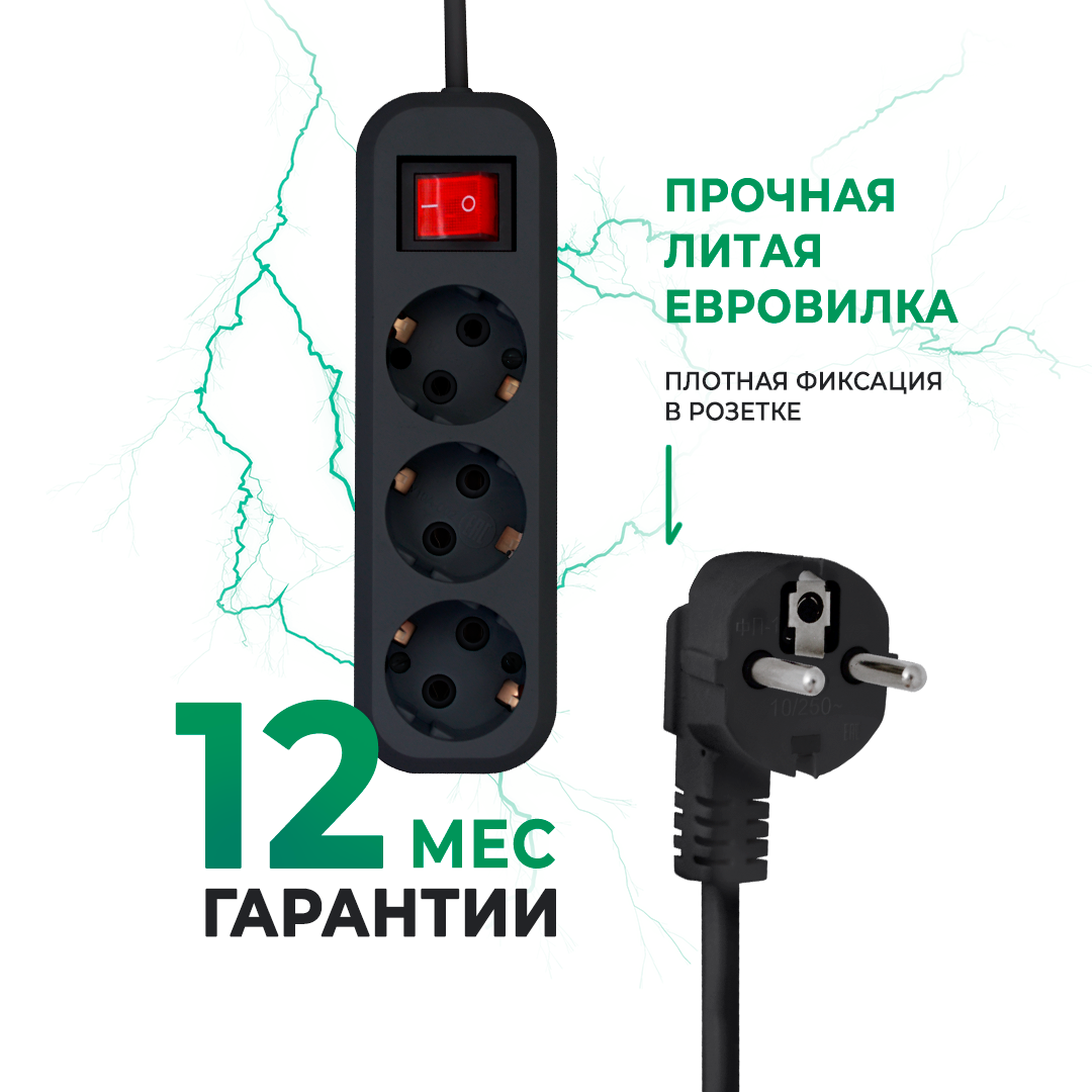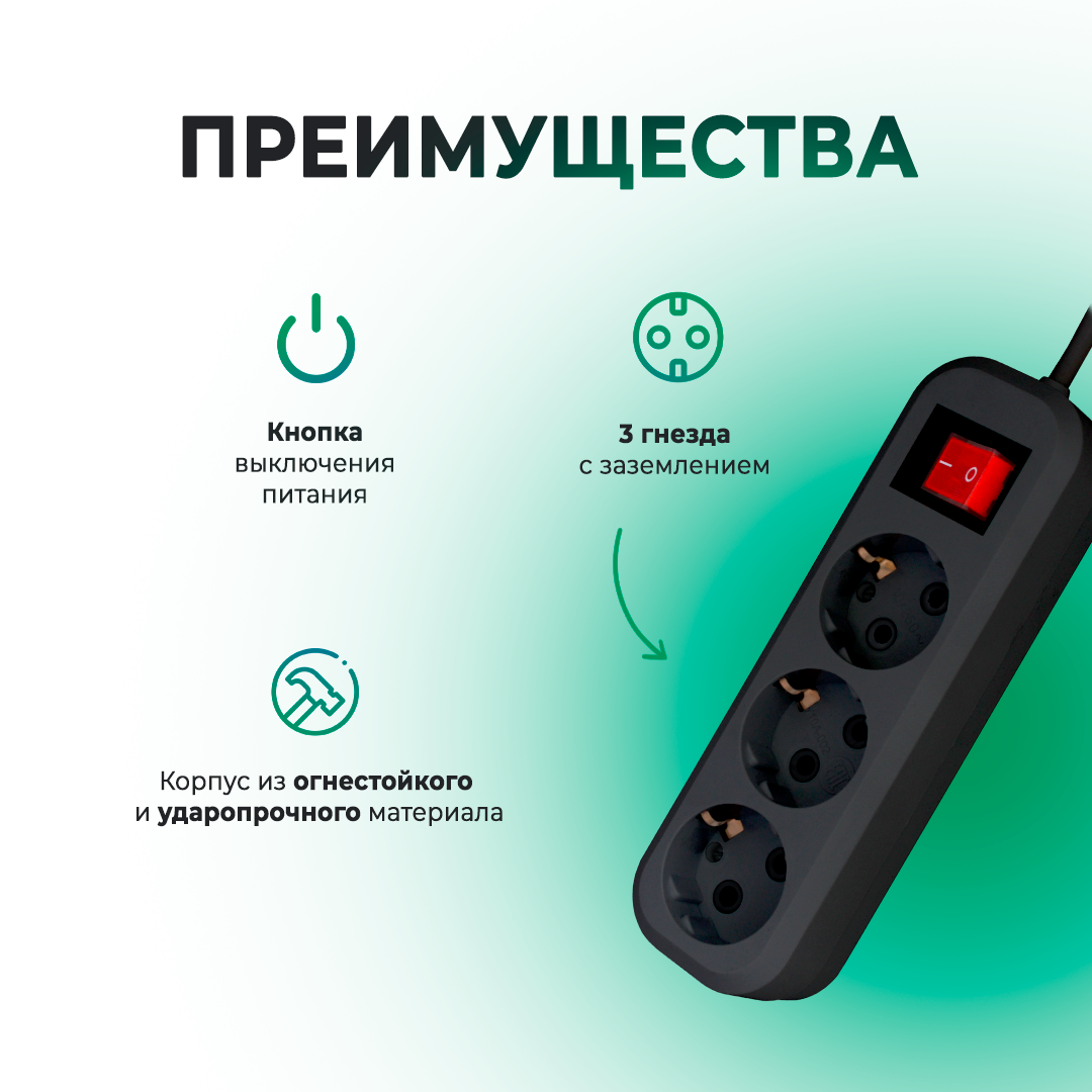 Отзывы на Удлинитель сетевой Progix 3 розетки, 2 метра, с заземлением, с выключателем, черный