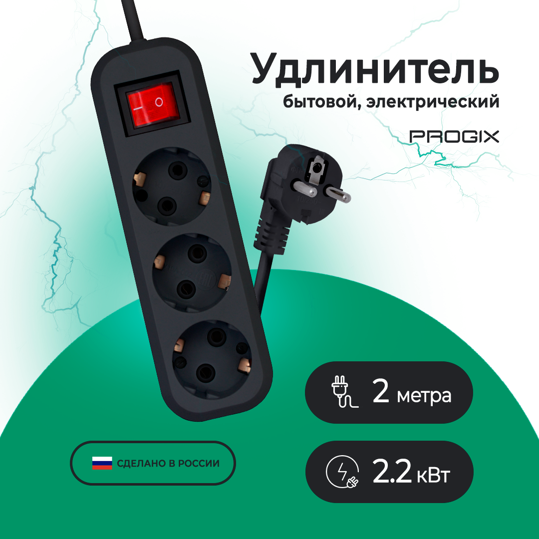 10 цен на Удлинитель сетевой Progix 3 розетки, 2 метра, с заземлением, с выключателем, черный