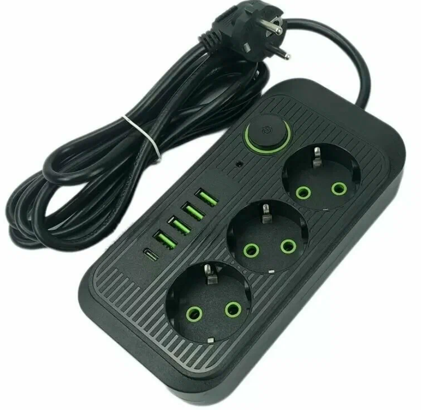 Отзывы на Сетевой фильтр удлинитель 3 метра с 3 розетками 4 USB +1 Type-C 2500 Вт с предохранителем и заземлением черный