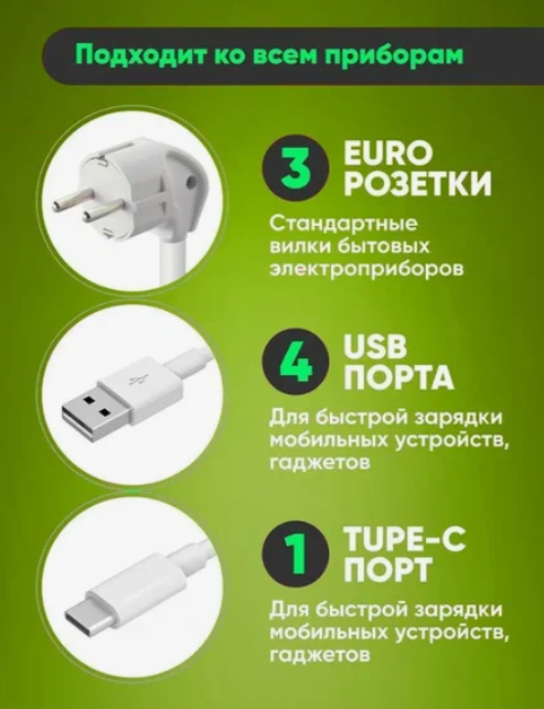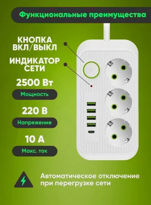 Отзывы на Сетевой фильтр удлинитель 2 метра с 3 розетками 4 USB +1 Type-C 2500 Вт с предохранителем и заземлением белый