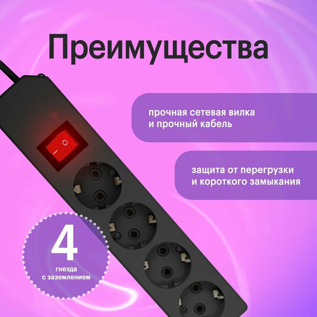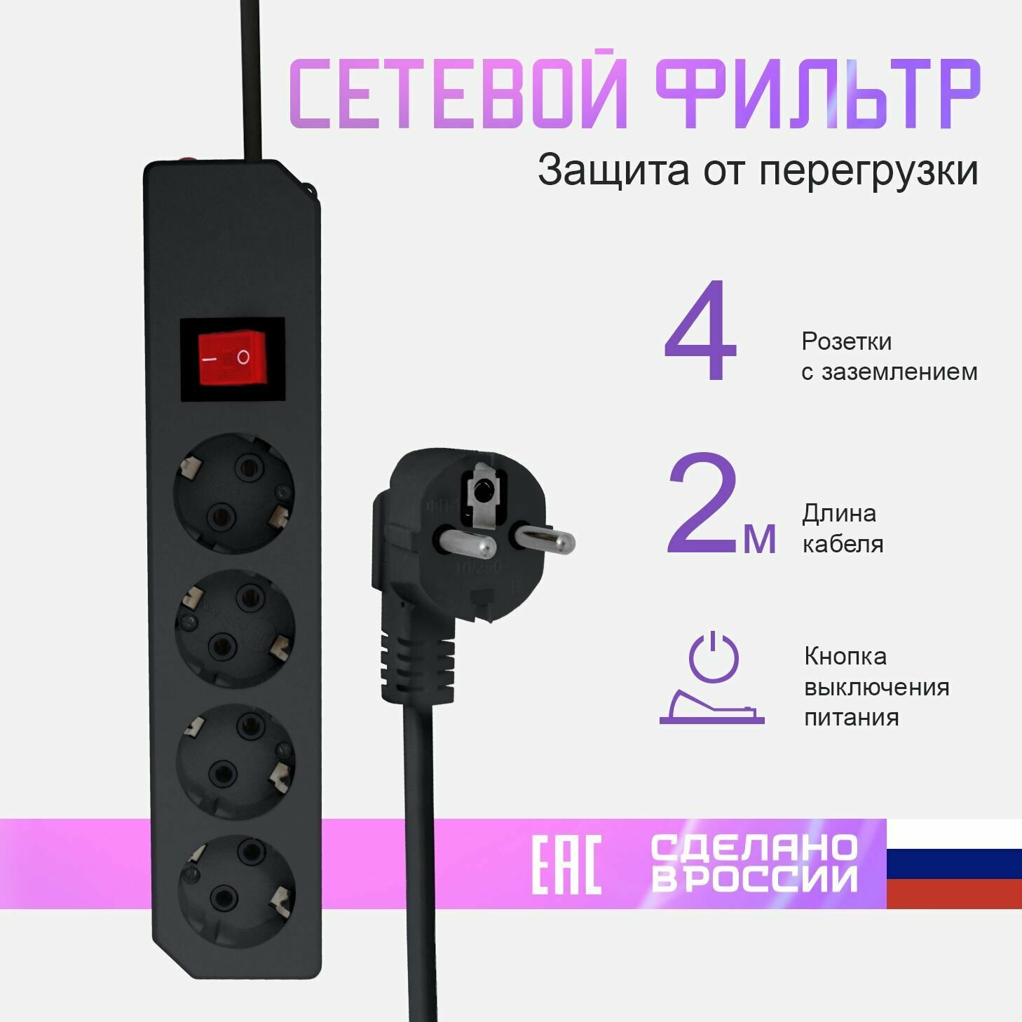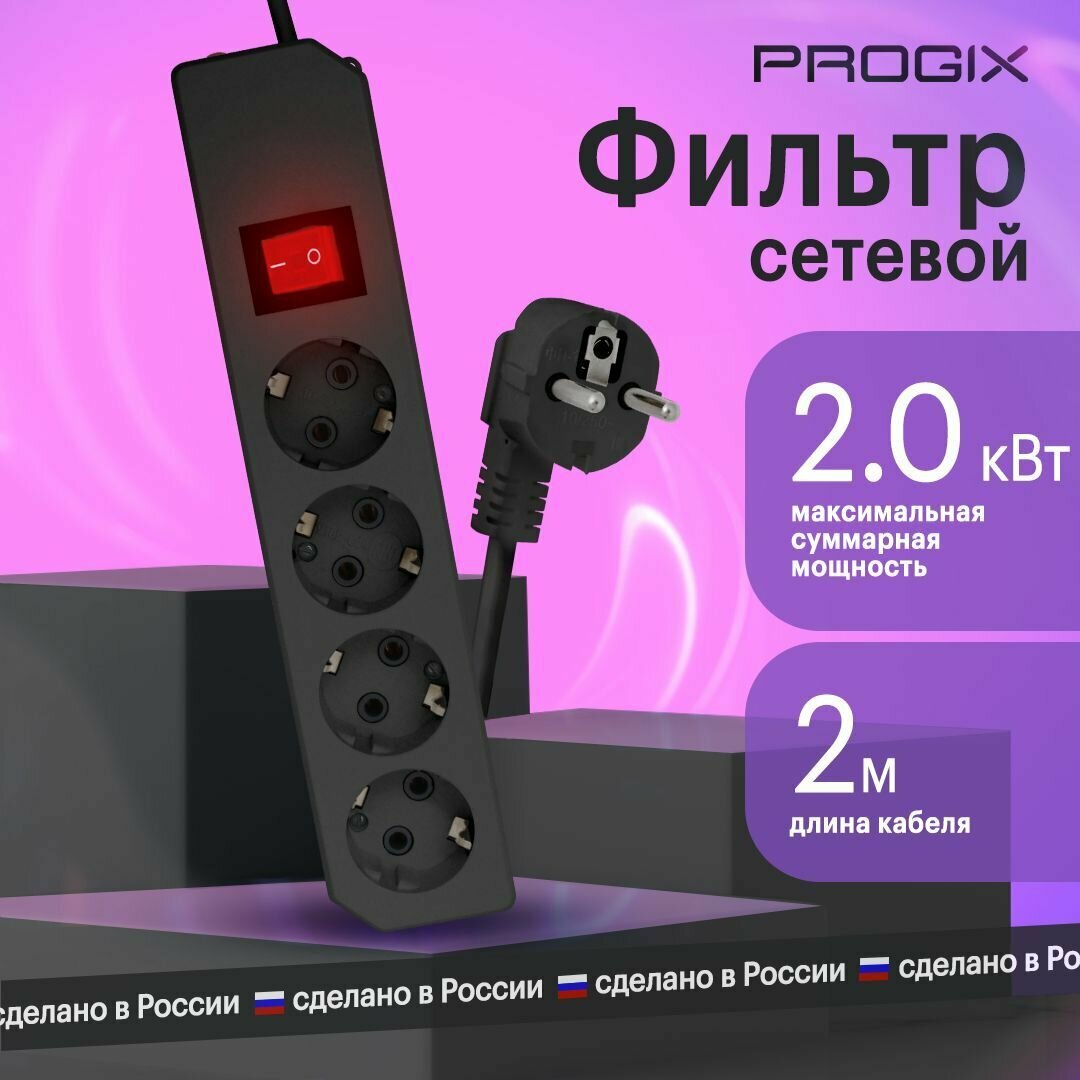 Cетевой фильтр - удлинитель Progix 4 розетки с заземлением, 10А/2кВТ, 2 метра, с выключателем, с предохранителем, без USB, черный информация: