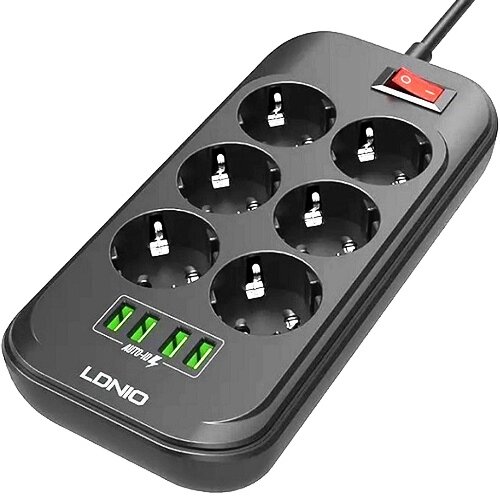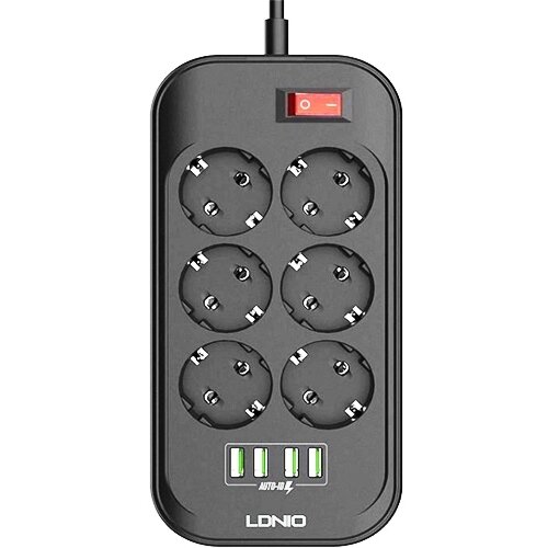 10 цен на Сетевой фильтр LDNIO SE6403 - 6 розеток 2500Вт медь + USB зарядка 4 порта 3.4A, черный - 6 метров