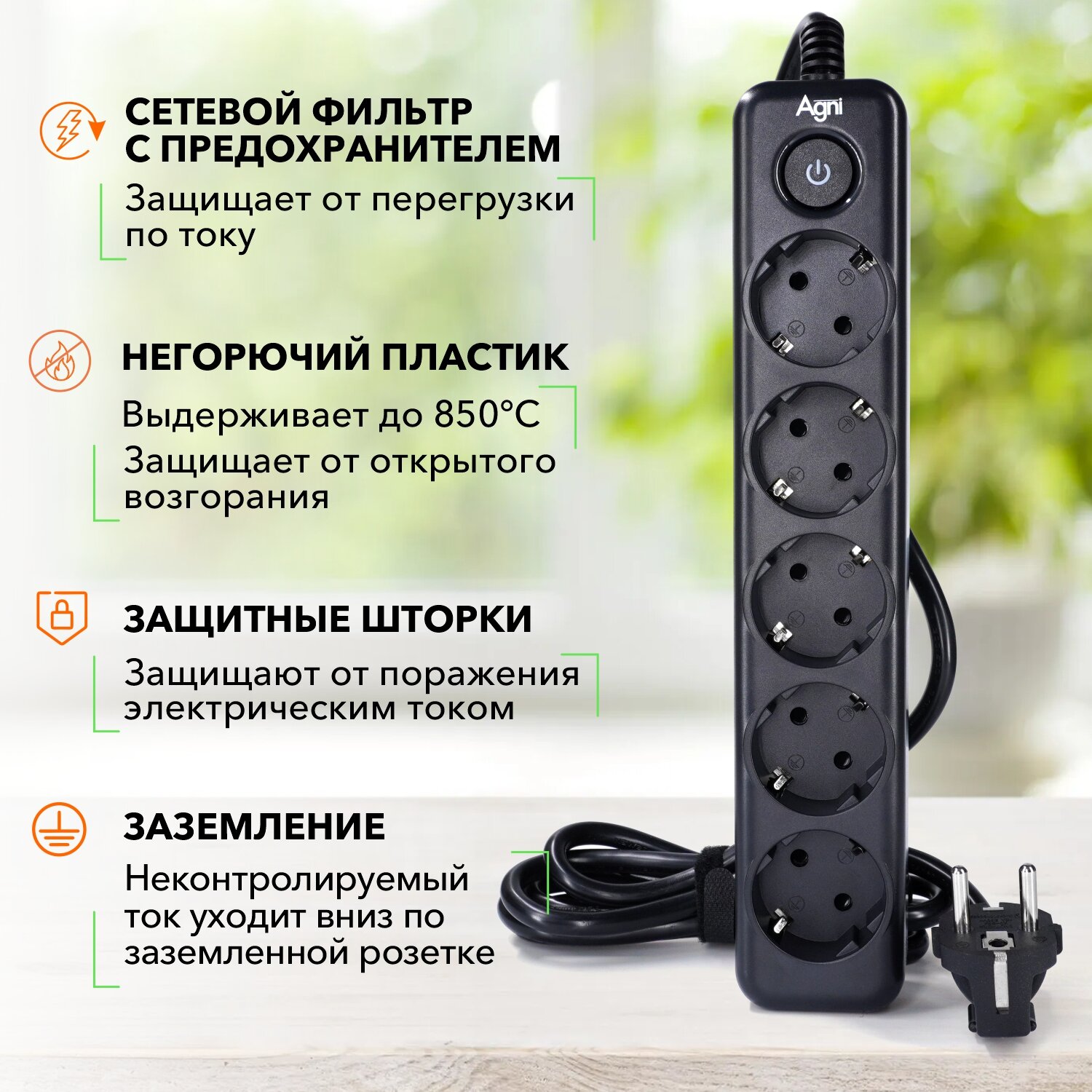 Отзывы на Сетевой фильтр с заземлением на 5 розеток AGNI с выключателем, защитные шторки, 4000 Вт/16 А, удлинитель 5 метров, черный