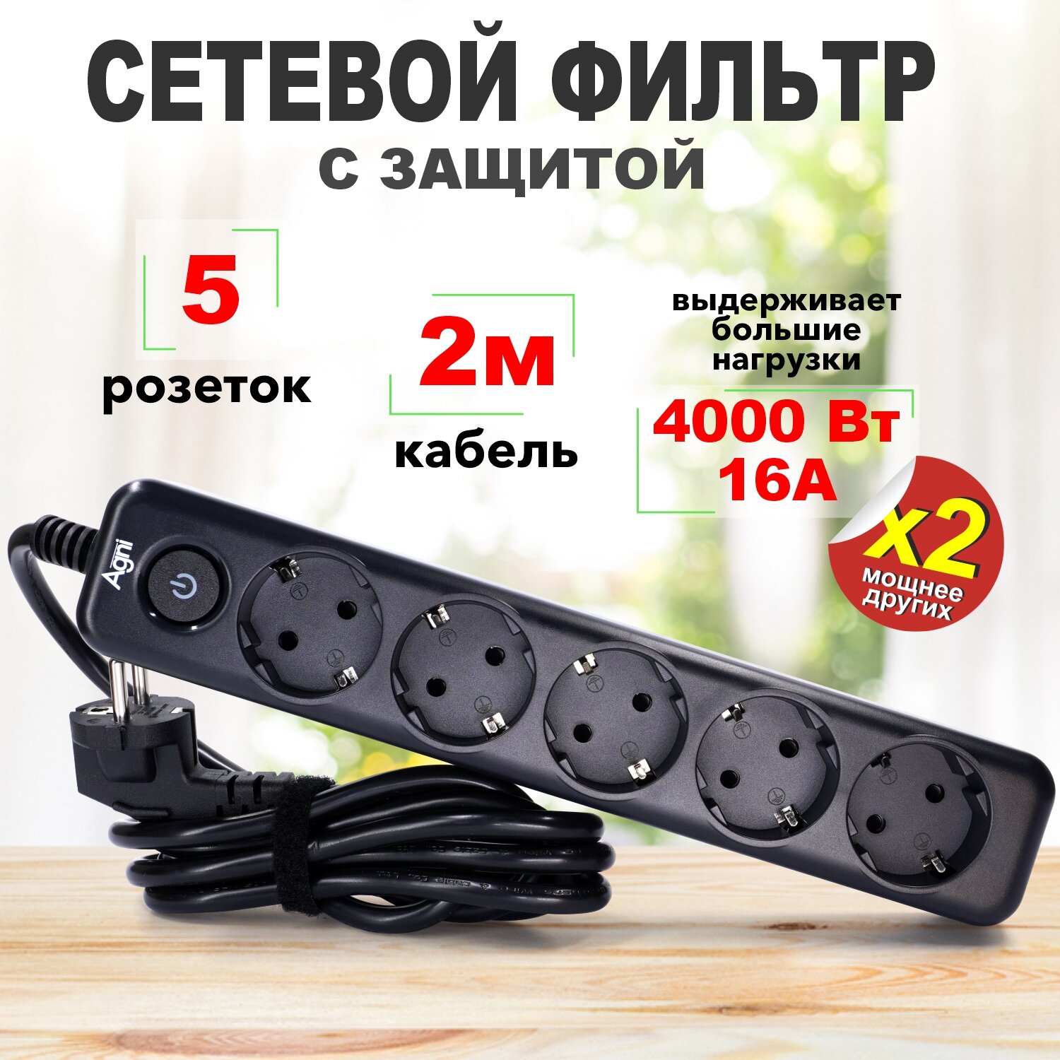 Отзывы на Сетевой фильтр с заземлением на 5 розеток AGNI с выключателем, защитные шторки, 4000 Вт/16 А, удлинитель 2 метра, черный