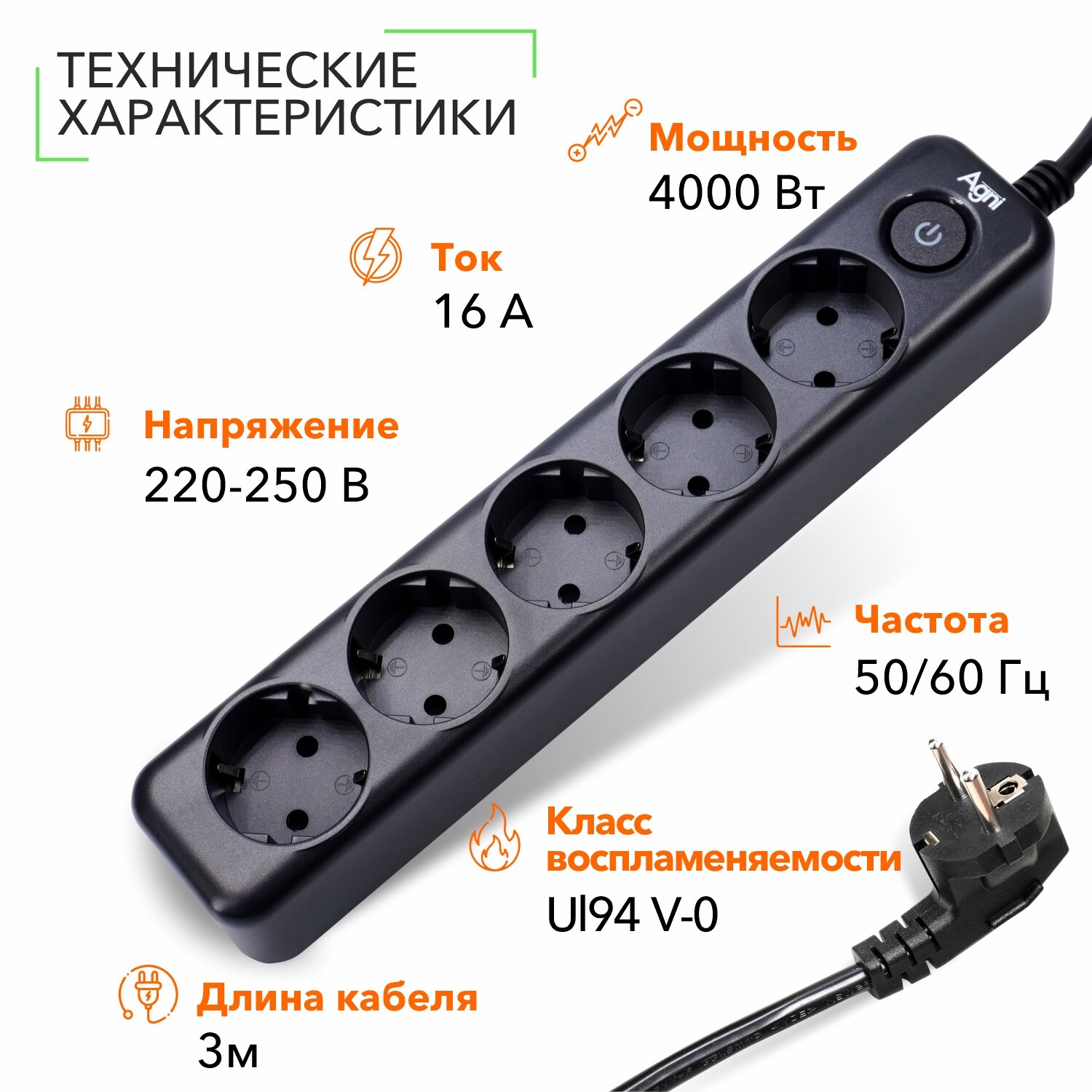 Сетевой фильтр с заземлением на 5 розеток AGNI с выключателем, защитные шторки, 4000 Вт/16 А, удлинитель 3 метра, черный информация:
