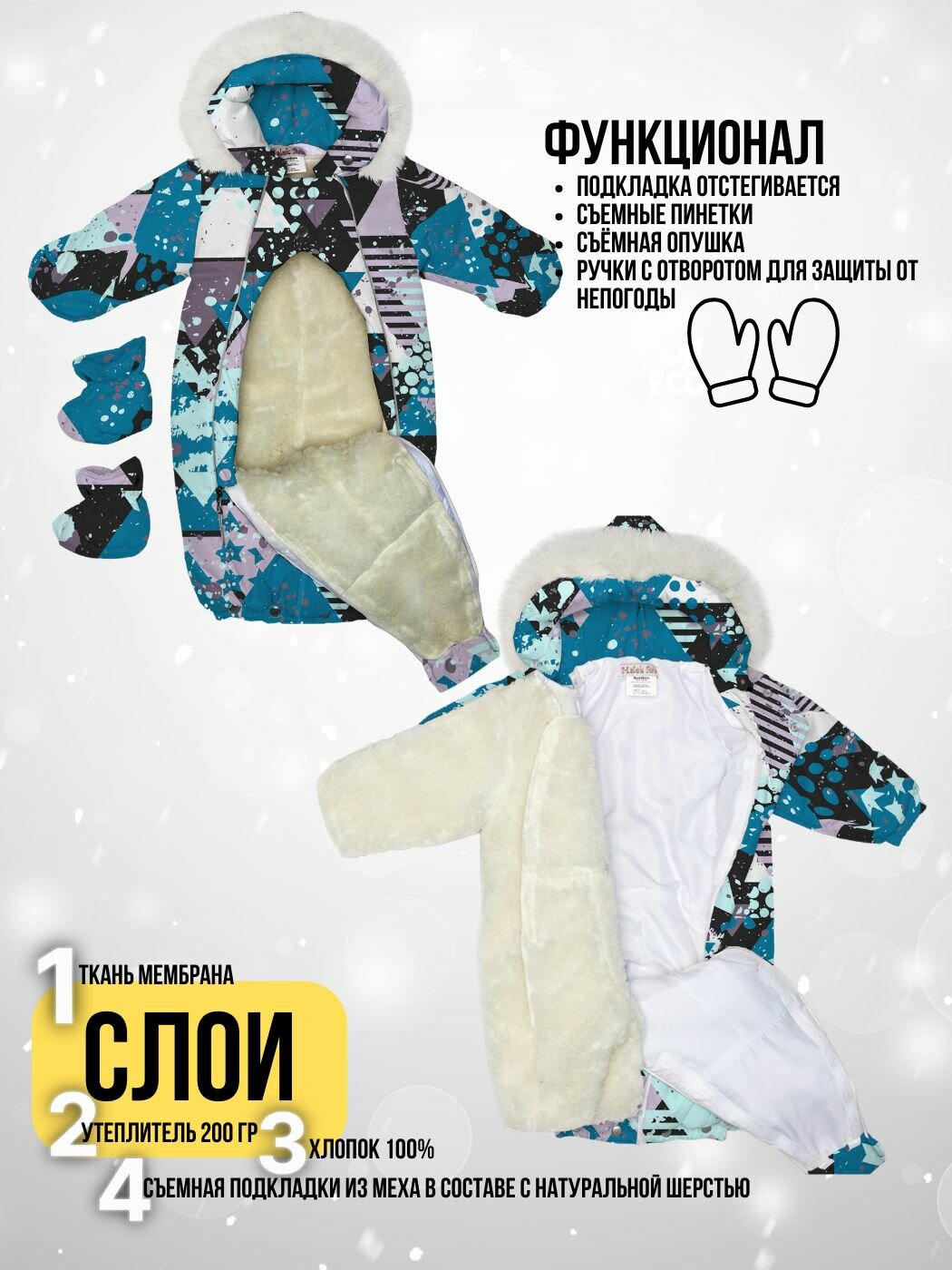 | Особенности модели | ветрозащита, водонепроницаемый, капюшон, карманы, мембрана, несъемный капюшон, пинетки в комплекте, подкладка, регулировка размера, регулируемый капюшон, светоотражающие элементы, съемная подкладка, съемный капюшон, съемный мех, утепленная |