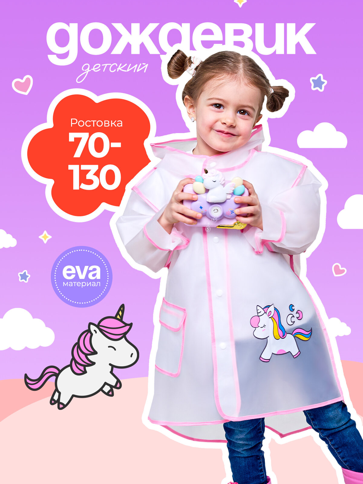 Отзывы на Дождевик детский Little Единорог / непромокаемый плащ с капюшоном для малыша девочки / прозрачный - розовый