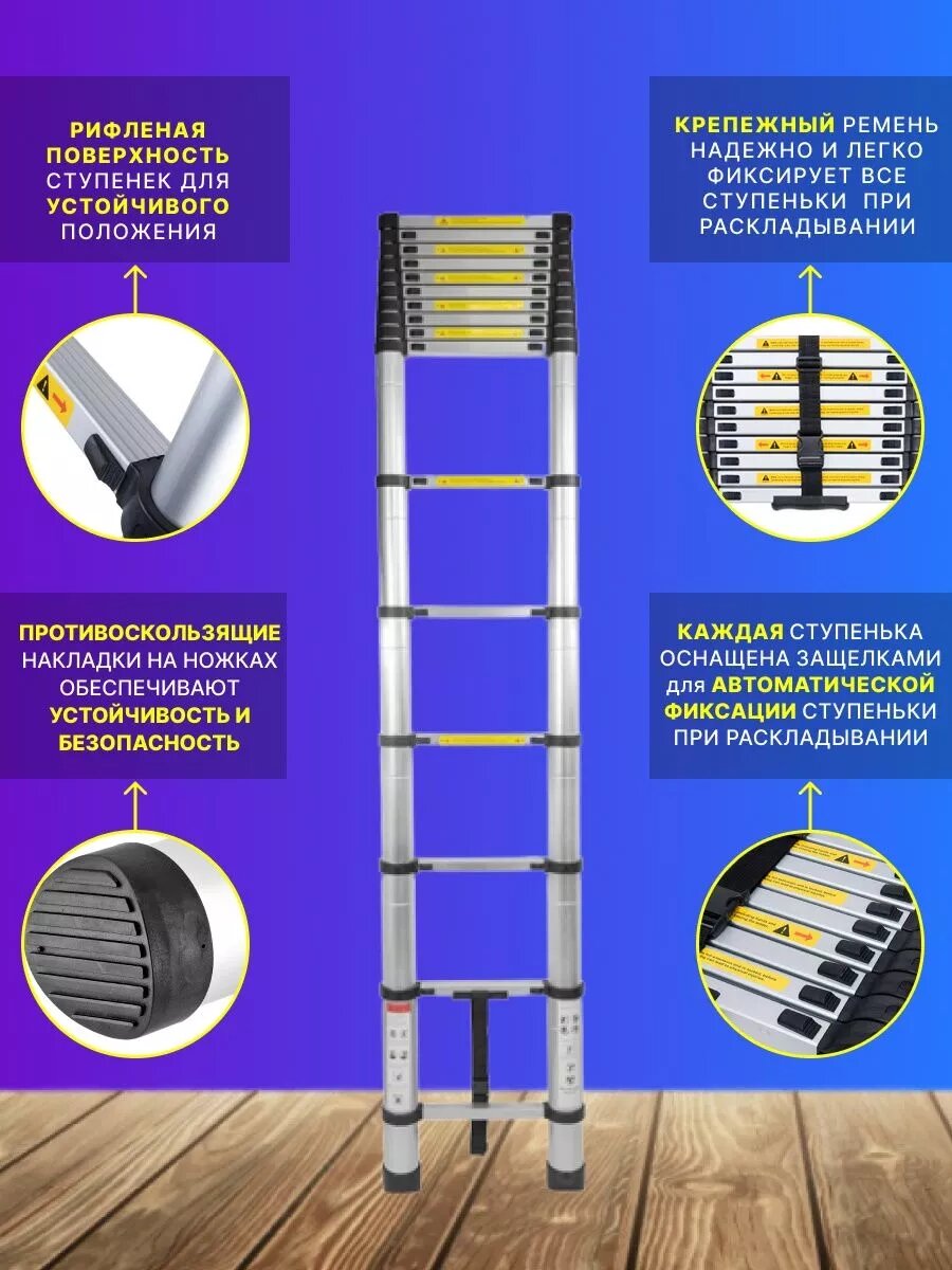 Лестница-стремянка телескопическая алюминиевая двухсекционная (2.6+2.6м,9+9ступенек, max нагрузка 150кг, вес 13.0кг) 17 904 ₽