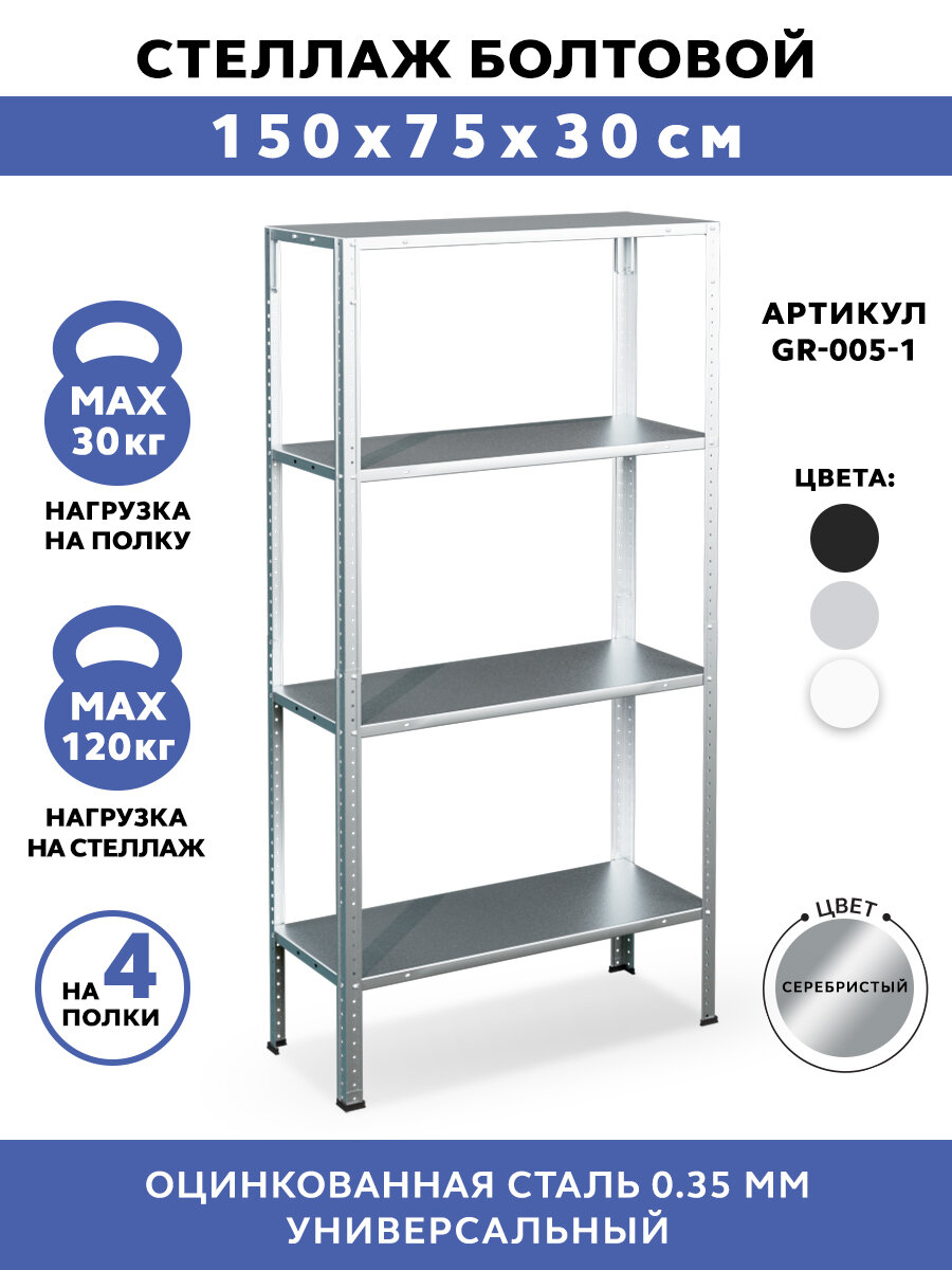 Стеллаж металлический болтовой GASTRORAG GR-005-4, 4 полки, размеры 150х75х30 см, этажерка для кухни, мебель лофт, подставка для цветов и рассады, система хранения для дома, дачи и гаража 2 490 ₽
