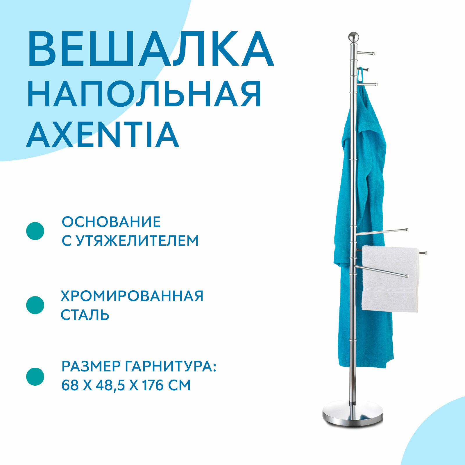 | Подобная комплектация | Вешалка для ванной Axentia Romino из высокопрочной хромированной стали, с круглым основанием и утяжелителем. ВЫСОТА 176 см. |