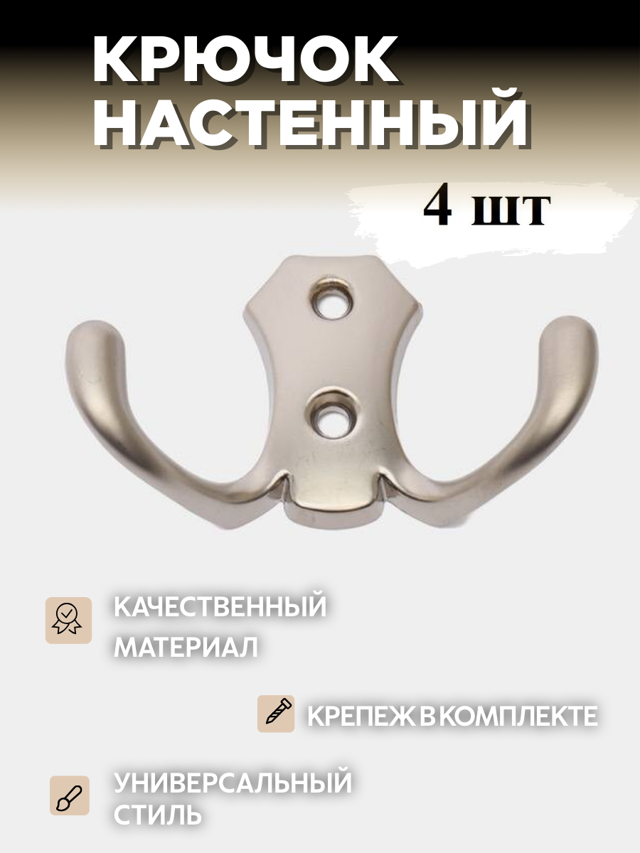 Крючок двухрожковый, настенный, матовый никель, 4 шт информация: